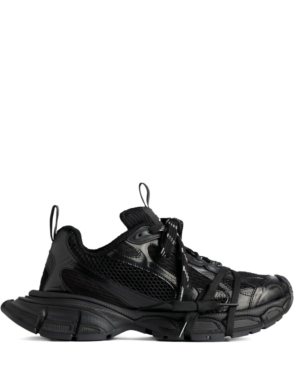 3XL lace-up sneakers An amped-up version of running shoes from the 2000s, Balenciaga’s black 3XL sneakers are a prime example of the label’s penchant for practical and disruptive design. They’re made from distressed panels of mesh and metallic rubber with exaggerated soles and an extra set of laces wound around the toes. Highlights - Black - Mesh panelling - Front lace-up fastening - Chunky rubber sole - Padded tongue Imported Composition Outer: Polyester 100%, Polyurethane 100% Lining: Foam 100% Sole: Rubber 100%, Polyethylene vinyl acetate (PEVA) 100% SIZE & FIT Measurement HEEL 1.77 in(4.5 cm) Sole height 0.98 in(2.5 cm)