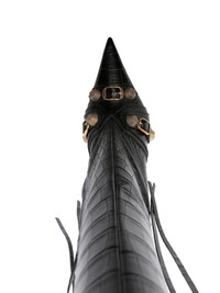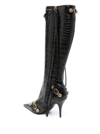 90mm Cagole boots Inspired by the brand's iconic Cagole bag silhouette, this pair of boots from Balenciaga's SS23 collection feature the same zip and stud embellishment that make them an instantly recognisable design. Highlights - Black - Calf leather - Embossed crocodile effect - Stud embellishment - Decorative buckle detailing - Zip detail - Pointed toe - Knee-high - Branded leather insole - Leather lining - 90mm high stiletto heel - Leather sole - Antique-effect hardware - Concealed side zip fastening - This piece comes complete with a protective dust bag. Made in Italy Composition Sole: Calf Leather 100% Outer: Calf Leather 100% Lining: Calf Leather 100% SIZE & FIT Measurement CIRCUMFERENCE 15.35 in(39 cm) HEEL 3.93 in(10 cm) HEIGHT 15.55 in(39.5 cm)