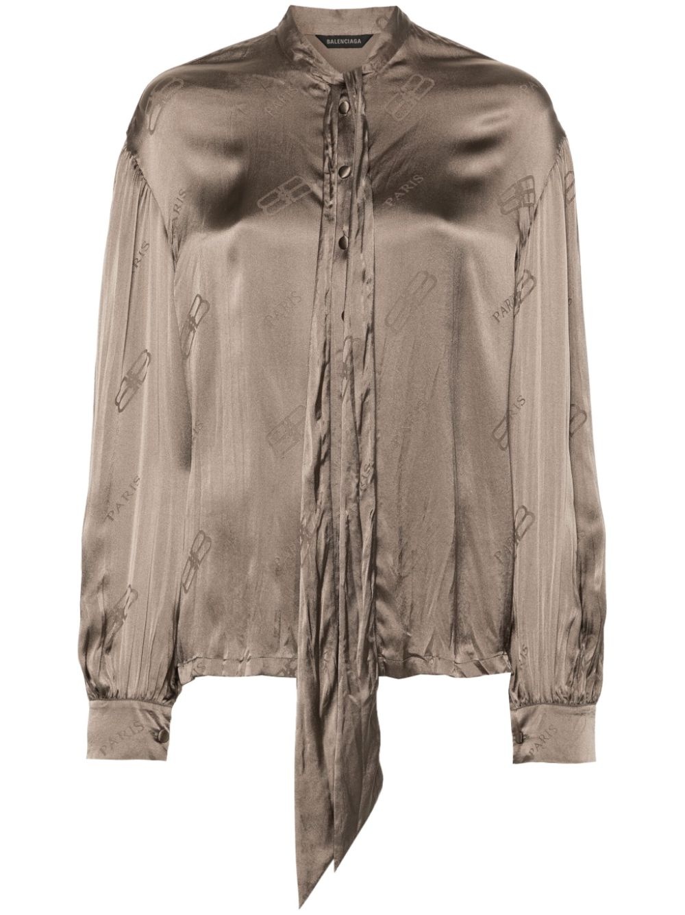 BB logo-print silk shirt Made from silk, this shirt by Balenciaga features a satin finish that brings a pearly effect to the garment. Boasting a discreet pussy-bow collar, it is accented by pleated sleeves, while the brand's BB logo print decorates the design. Highlights - Beige - Silk - Satin finish - All-over logo print - Pussy-bow collar - Front button fastening - Drop shoulder - Long sleeves - Pleat detailing - Buttoned cuffs - Straight hem Made in Italy Composition Silk 100% SIZE & FIT Model measurements Height 5 ft 10 in(1.77 m) Bust/Chest 34.64 in(88 cm) Hips 35.43 in(90 cm) Waist 24.8 in(63 cm) FittingInformation Designed to be unstructured, offering a loose fit throughout Made from a lightweight non-stretch fabric This piece fits true to size – take your usual size Washing instructions Dry Clean Only