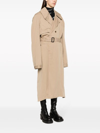 belted trench coat Balenciaga offers a signature touch to this classic trench coat design. Made from wool and cotton, it's cinched in at the waist with a belt and complete with a statement rear slit. Highlights - Sand beige - Wool - Cotton - Wide peak lapels - Double-breasted button fastening - Belted waist - Long sleeves - Rear slit - Mid-length Made in Italy Composition Lining: Cupro 100%, Wool 100%, Cotton 100% Outer: Cotton 100% SIZE & FIT Model measurements Height 5 ft 11 in(1.8 m) Bust/Chest 31.49 in(80 cm) Hips 36.22 in(92 cm) Waist 25.59 in(65 cm) Measurement SLEEVE LENGTH 19.68 in(50 cm) LENGTH 53.14 in(135 cm) WAIST 45.66 in(116 cm) BUST 48.81 in(124 cm) FittingInformation Designed for an oversized fit, offering additional room throughout The belt offers adjustability for fitted preferences Made from a midweight non-stretch fabric This piece fits true to size – take your usual size