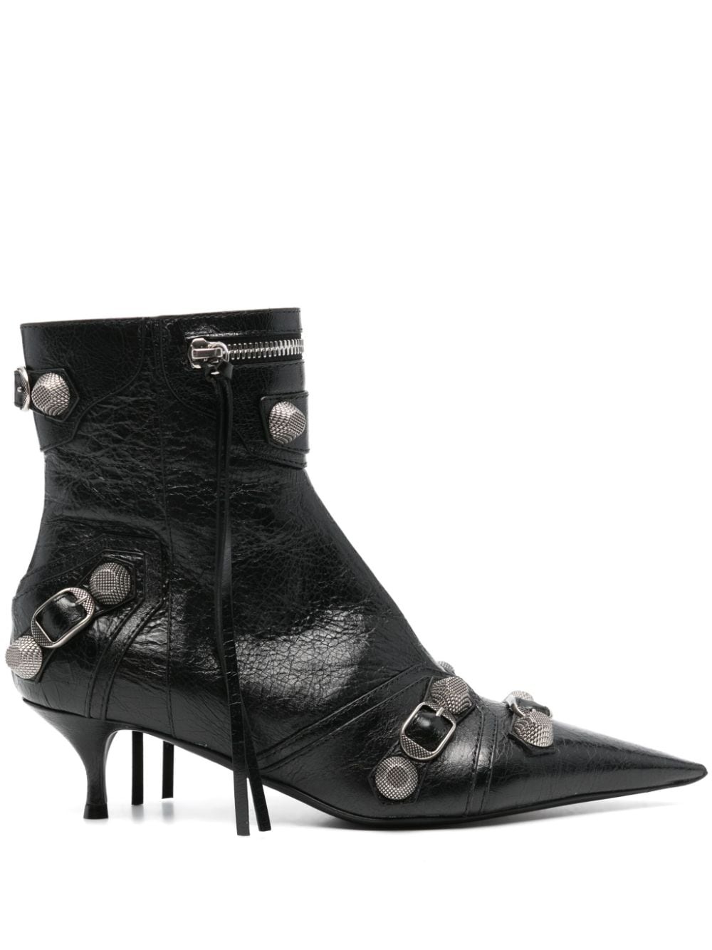 Cagole 55mm leather boots Highlights - Black - Lambskin - Cracked texture - Decorative buckle with silver-tone stud detailing - Decorative zip detailing - Logo at the sole - Pointed toe - Concealed side zip fastening - Ankle-length - Low sculpted heel - Leather outsole Made in Italy Composition Outer: Lamb Skin 100% Lining: Calf Leather 100% Sole: Calf Leather 100% SIZE & FIT Measurement CIRCUMFERENCE 9.05 in(23 cm) HEEL 2.16 in(5.5 cm) HEIGHT 5.7 in(14.5 cm) Sole height 0.39 in(1 cm)