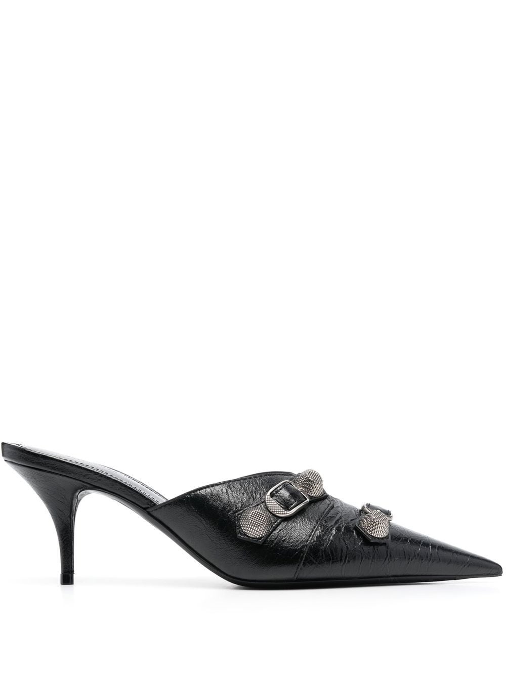 Cagole 80mm pointed mules These Cagole 80mm mules, which drew inspiration from Balenciaga's Le Cagole purse, reflect characteristics of the houses signature design with an added air of grandeur. The distinctive silver-tone hardware enhances the silhouette, giving the edgy style a glam upgrade. Made in Italy Composition Lining: Calf Leather 100% Sole: Calf Leather 100% Outer: Calf Leather 100% SIZE & FIT Measurement HEEL 3.14 in(8 cm)