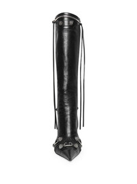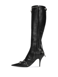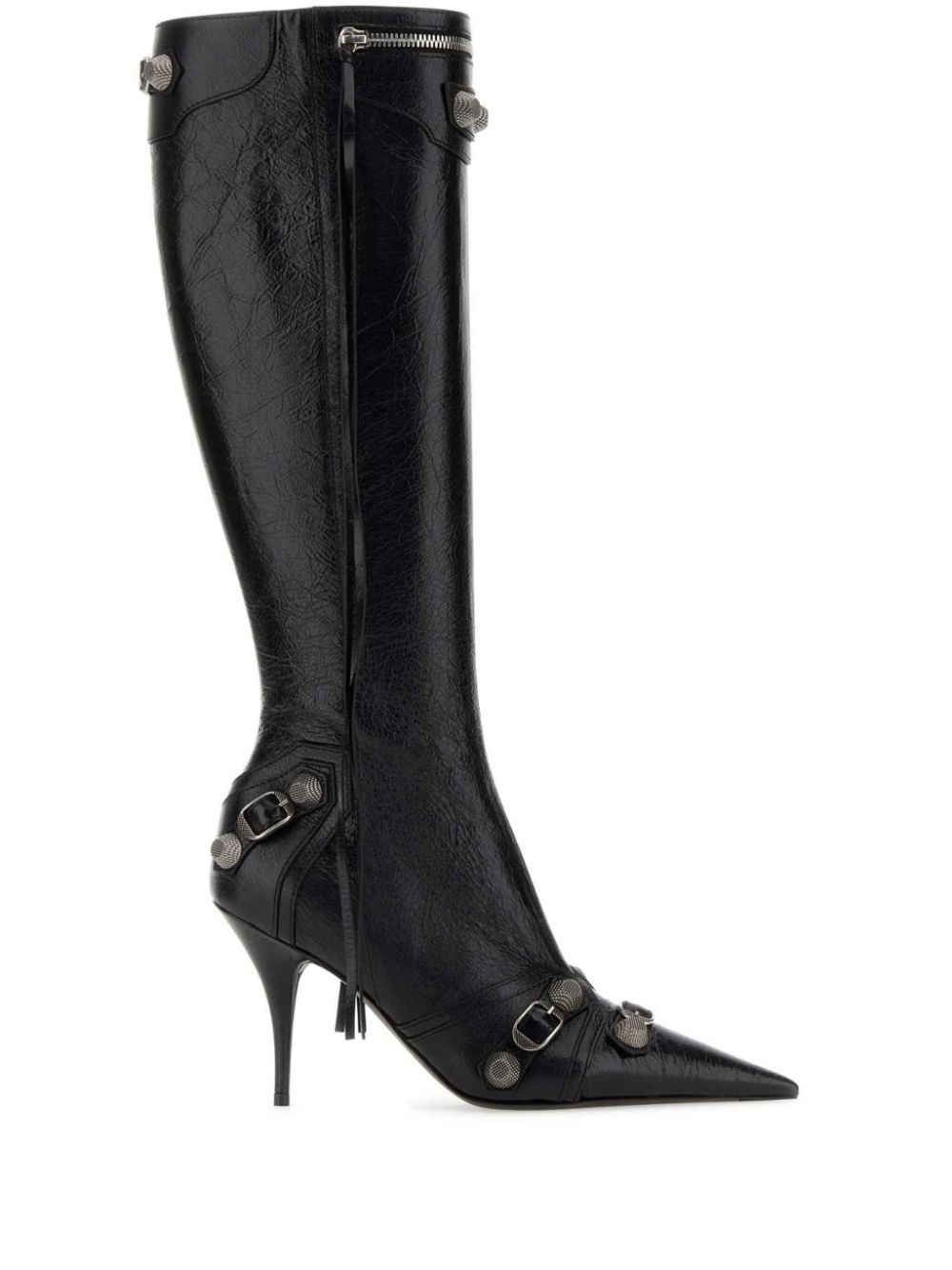 90mm Cagole leather boots Riffing on their coveted Le Cagole handbag line, Balenciaga's Cagole boots are enriched with the same stud and buckle hardware as their predecessor. As pictured by this iteration, the palladium-plated hardware is paired with crispy textured leather, another trait of the bag, which also contributes to their decadence. Highlights - Black - Lambskin - Pointed toe - High stiletto heel - Palladium-tone hardware - Stud embellishment - Fringe detailing - Side zip fastening Made in Italy Composition Lining: Leather 100% Sole: Leather 100% Outer: Lambskin 100% SIZE & FIT Measurement CIRCUMFERENCE 12.99 in(33 cm) HEEL 3.54 in(9 cm) Sole height 0.39 in(1 cm)