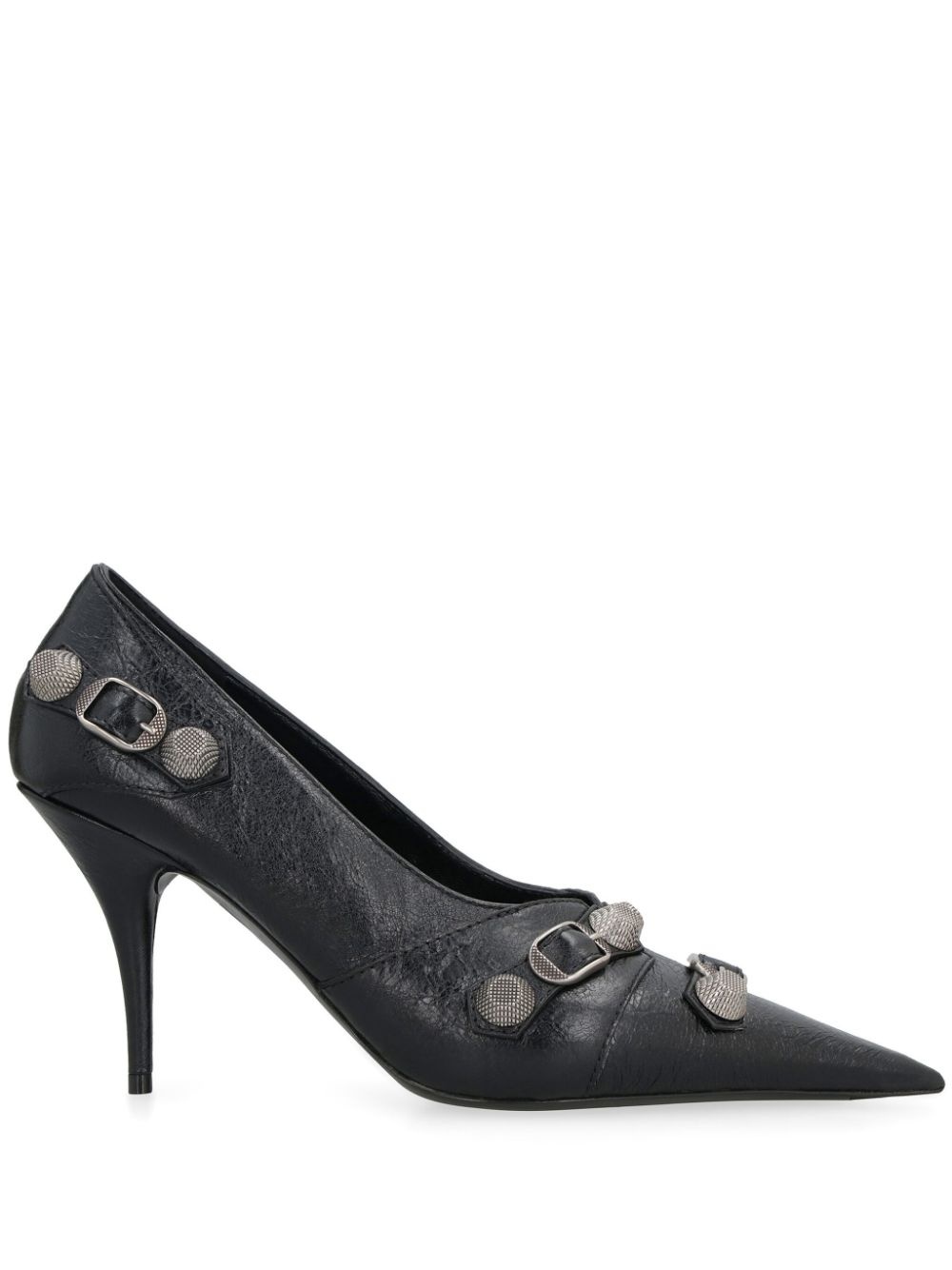 Cagole 90mm cracked pumps Highlights - Black - Lambskin - Decorative buckle detail - Pointed toe - Slip-on style - Branded insole - High 90mm heel Made in Italy Composition Outer: Lambskin 100% Lining: Lambskin 100% Sole: Lambskin 100% SIZE & FIT Measurement HEEL 2.75 in(7 cm)