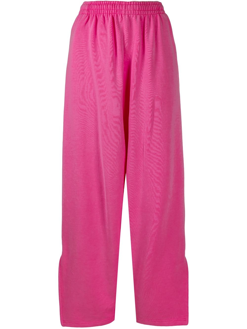 cotton track pants Hit the streets in style with these Balenciaga track pants. Made from cotton, they'll guarantee a comfy and laid-back look all day long. Pink-y promise. Highlights - Pink - Cotton - Elasticated waistband - Two side welt pockets - Rear welt pocket - Loose fit Imported Composition Cotton 100% SIZE & FIT Model measurements Height 5 ft 11 in(1.8 m) Bust/Chest 32.67 in(83 cm) Hips 36.22 in(92 cm) Waist 24.4 in(62 cm) FittingInformation This piece fits true to size. We recommend you get your regular size Designed to be fitted at the waist, loose over the leg Made with a mid-weight fabric Washing instructions Hand Wash