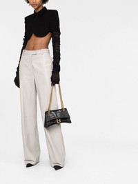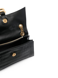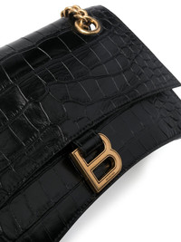 small Crush crocodile-embossed shoulder bag Defined by its arching silhouette, Balenciaga's Crush bag highlights the brand's focus on contemporary shapes. This iteration is reimagined with a mock croc leather construction that brings texture to the sculptural style. Highlights - Black - Calf leather - Embossed crocodile effect - Gold-tone hardware - Gold-tone logo plaque - Sliding chain-link shoulder strap - Foldover top with press-stud fastening - Main compartment Made in Italy Composition Outer: Calf Leather 100% SIZE & FIT Model measurements Height 5 ft 11 in(1.8 m) Bust/Chest 31.49 in(80 cm) Hips 35.82 in(91 cm) Waist 24.8 in(63 cm) Measurement DEPTH 2.75 in(7 cm) HANDLE 11.81 in(30 cm) HEIGHT 5.9 in(15 cm) STRAP 21.25 in(54 cm) WIDTH 9.84 in(25 cm)