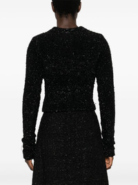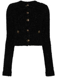 cropped jacket Highlights - Black - Cotton blend - Boucle construction - Metallic threading - Crew neck - Long sleeves - Two front patch pockets - Logo-embossed buttons - Cropped - Full lining - Straight hem - Front button fastening Made in Italy Composition Outer: Cotton 73%, Polyamide 24%, Viscose 2%, Elastane 1% Lining: Polyester 87%, Elastane 13% SIZE & FIT Model measurements Height 5 ft 10 in(1.77 m) Bust/Chest 32.28 in(82 cm) Hips 35.03 in(89 cm) Waist 25.19 in(64 cm) Measurement BUST 25.98 in(66 cm) LENGTH 16.92 in(43 cm) WAIST 24.4 in(62 cm) SLEEVE LENGTH 29.92 in(76 cm) Shoulder Width 13.77 in(35 cm) FittingInformation Designed for a close fit throughout Made from a midweight stretch fabric, this piece offers elasticity and flexibility when worn This piece fits small – take one size up