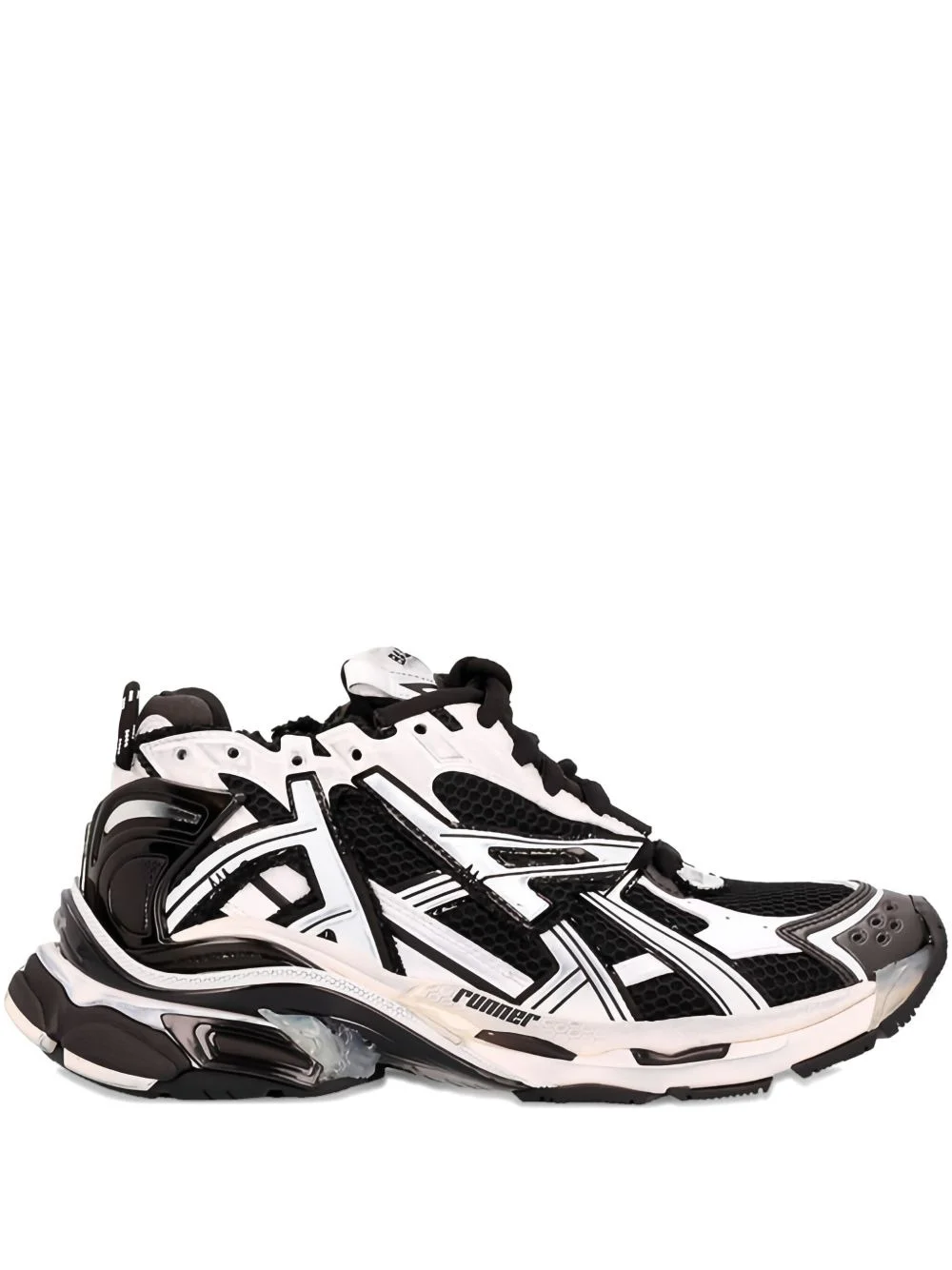 Runner low-top sneakers Balenciaga continues to champion sportswear aesthetic with this pair of white and red runner sneakers. Featuring mesh panelling across the upper, this element provides ventilation whilst on the move and a chunky ridged rubber sole gives ample support. Highlights - Cloud white/bright red - Intarsia knit - Logo-embroidered tongue - Front lace-up fastening - Branded insole - Round toe - Chunky rubber sole Imported Composition Outer: Polyurethane 65%, Polyester 35% Sole: Rubber 100% Lining: Fabric 100%