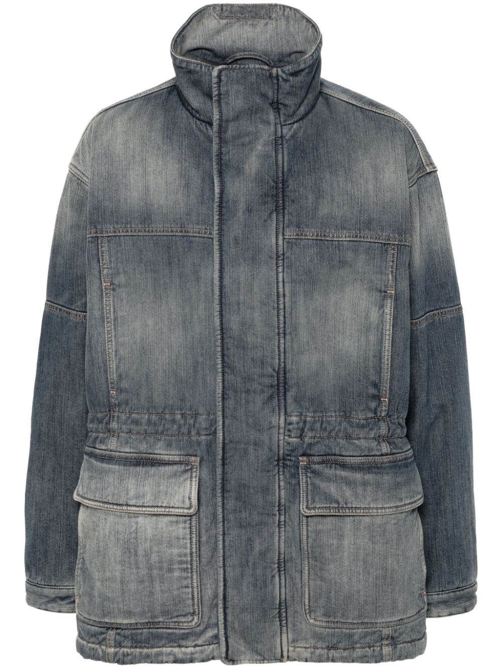distressed jacket Imagined in a faded denim effect, this jacket from Balenciaga is cut to a relaxed silhouette for AW23, showcasing the brand's contemporary aesthetic. Highlights - Steel blue - Cotton - Denim - Faded effect - Distressed effect - High neck - Long sleeves - Buttoned cuffs - Elasticated waistband - Two front flap pockets - Straight hem - Front press-stud and zip fastening - When buying this unisex item, keep in mind that it is graded in standard men's sizing. Made in Italy Composition Lining: Cotton 100%, Polyester 100% Outer: Cotton 100% SIZE & FIT Model measurements Height 5 ft 9 in(1.75 m) Bust/Chest 32.67 in(83 cm) Hips 36.22 in(92 cm) Waist 24.8 in(63 cm) FittingInformation This piece is unisex – if you usually select men's sizing expect a loose fit throughout; if you usually select women's sizes, expect an oversized fit The adjustable drawstring means that you can adjust this piece’s fit to suit your comfort and preference Made from a padded non-stretch fabric, giving it no natural elasticity