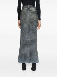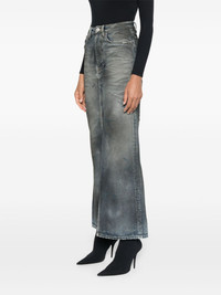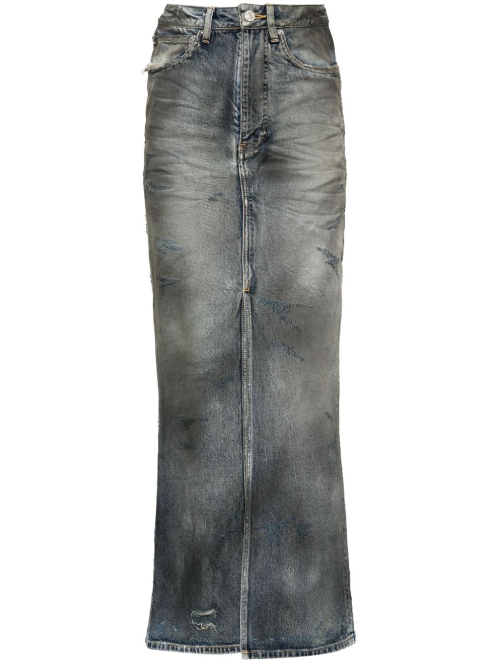 distressed denim maxi skirt Balenciaga gives a refresh to the classic denim skirt as seen in this garment from the AW23 collection. Crafted from pure cotton, the maxi silhouette is elevated by its dirty effect that lends the garment a love-worn finish. Highlights - Indigo blue - Cotton - Distressed effect - Ripped detailing - Logo patch to the rear - Mid-rise - Concealed fly and button fastening - Belt loops - Classic five pockets - Front slit - Unlined - Straight hem - Maxi Imported Composition Outer: Cotton 100% Lining: Cotton 100% SIZE & FIT Model measurements Height 5 ft 10 in(1.78 m) Bust/Chest 33.07 in(84 cm) Hips 36.61 in(93 cm) Waist 24.8 in(63 cm) Measurement HIPS 33.85 in(86 cm) LENGTH 41.73 in(106 cm) WAIST 27.55 in(70 cm) FittingInformation This maxi-length skirt is intended to be worn just below the waist Sturdy and hard-wearing, this denim piece offers no stretch This piece fits true to size – take your usual size Washing instructions Machine Wash
