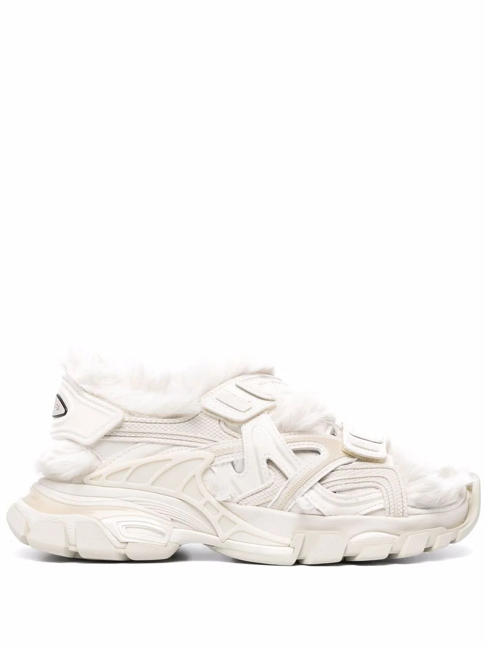 faux-fur Track sandals Balenciaga's fascination with the intersection of where 'ugly things become beautiful', influences the brand's aesthetic. As pioneers of combining technically constructed sports footwear with contemporary style details, this iteration showcases an open toe, touch-strap fastening and faux-fur lining. Highlights - Light beige - Chunky rubber sole - Faux-fur lining - Touch-strap fastening - Logo-embossed strap Imported Composition Other fibres 100% SIZE & FIT Measurement HEEL 1.57 in(4 cm) Sole height 0.78 in(2 cm)
