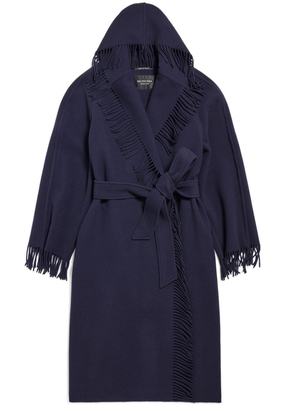 fringed-edge wool coat Highlights - Navy blue - Virgin wool - Felted - Fringed edge - Slouchy hood - Wrap design - Front tie fastening - Long sleeves - Belted waist - Mid-length - Straight hem Made in Italy Composition Virgin Wool 100% SIZE & FIT FittingInformation Designed to be unstructured, offering a loose fit throughout The tie fastening gives an adaptable and personalised fit Made from a midweight non-stretch fabric This piece fits true to size – take your usual size Measurement BUST 52 in(132.1 cm) LENGTH 45.98 in(116.8 cm) WAIST 55 in(139.7 cm) SLEEVE LENGTH 25.98 in(66 cm)