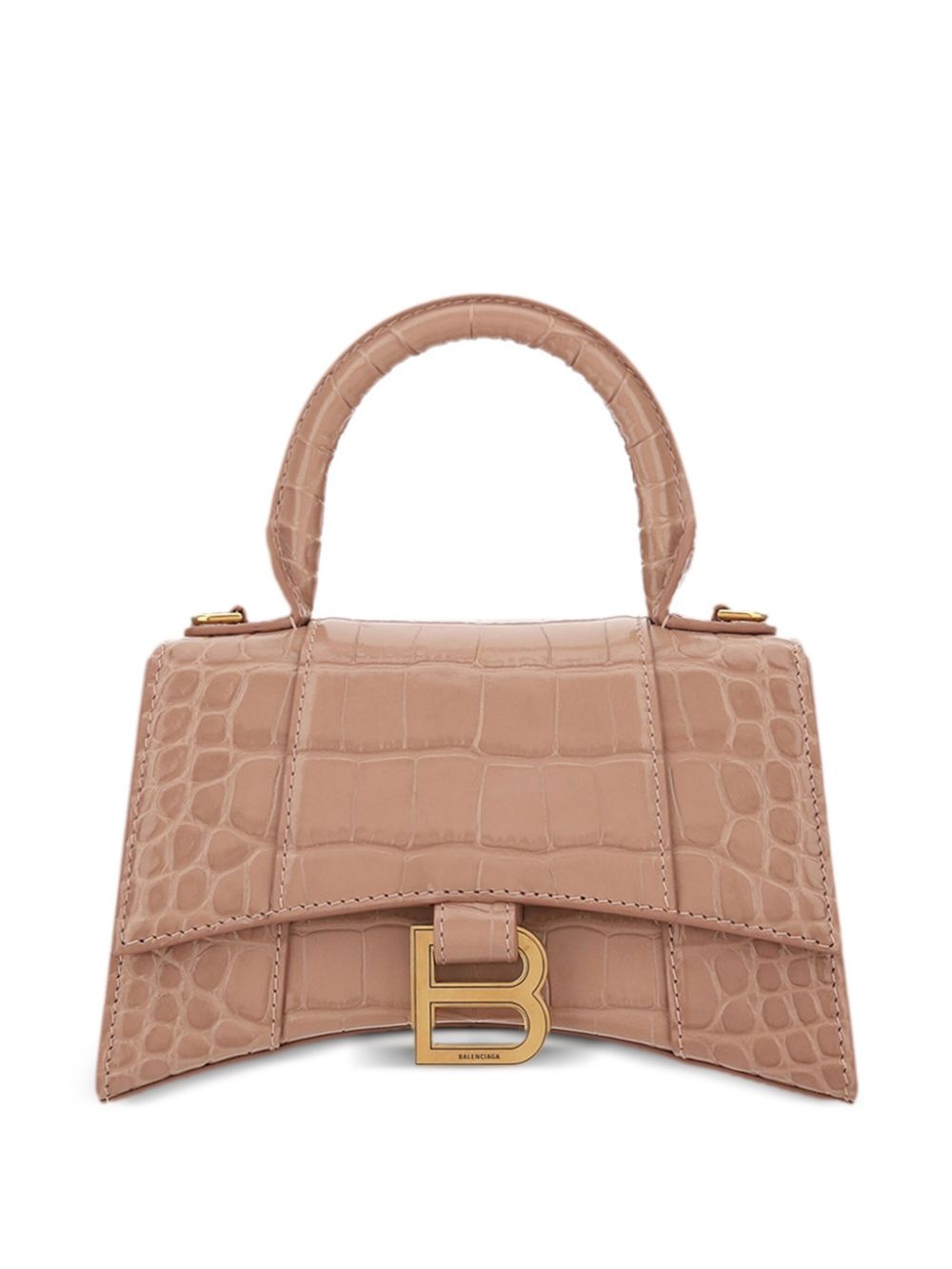 Hourglass XS top-handle bag Debuted in 2019, the Hourglass bag has become one of Balenciaga's iconic pieces. Made from leather, the famous curvy silhouette appears here in a crocodile effect adorned with the classic B-shaped logo at the front. Highlights - Sesame beige - Leather - Embossed crocodile effect - Gold-tone hardware - Foldover top with magnetic fastening - Main compartment - Single circular top handle - Adjustable detachable shoulder strap Made in Italy Composition Outer: Calf Leather 100% Lining: Lamb Skin 100% SIZE & FIT Measurement STRAP 23.22 in(58.9 cm) DEPTH 2.95 in(7.5 cm) WIDTH 7.28 in(18.5 cm) HEIGHT 4.72 in(12 cm)