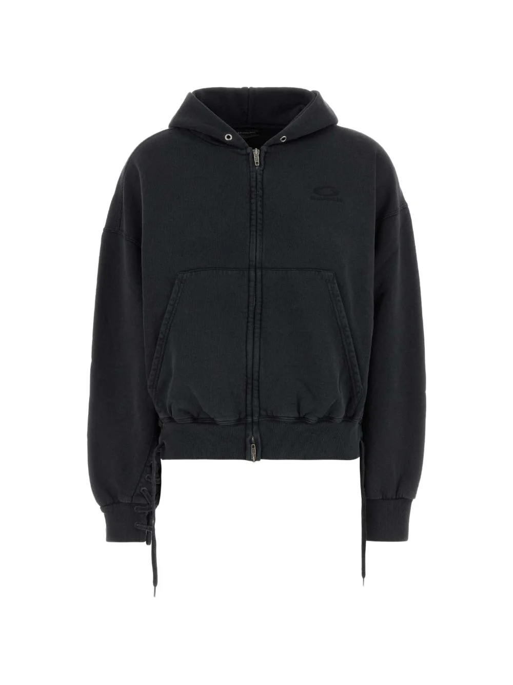 laced-sleeves hoodie Highlights - Washed black - Hood without drawstring - Zip fastening - Front pouch pockets - Laced sleeves and sides Imported Composition Cotton 100% Washing instructions Machine Wash