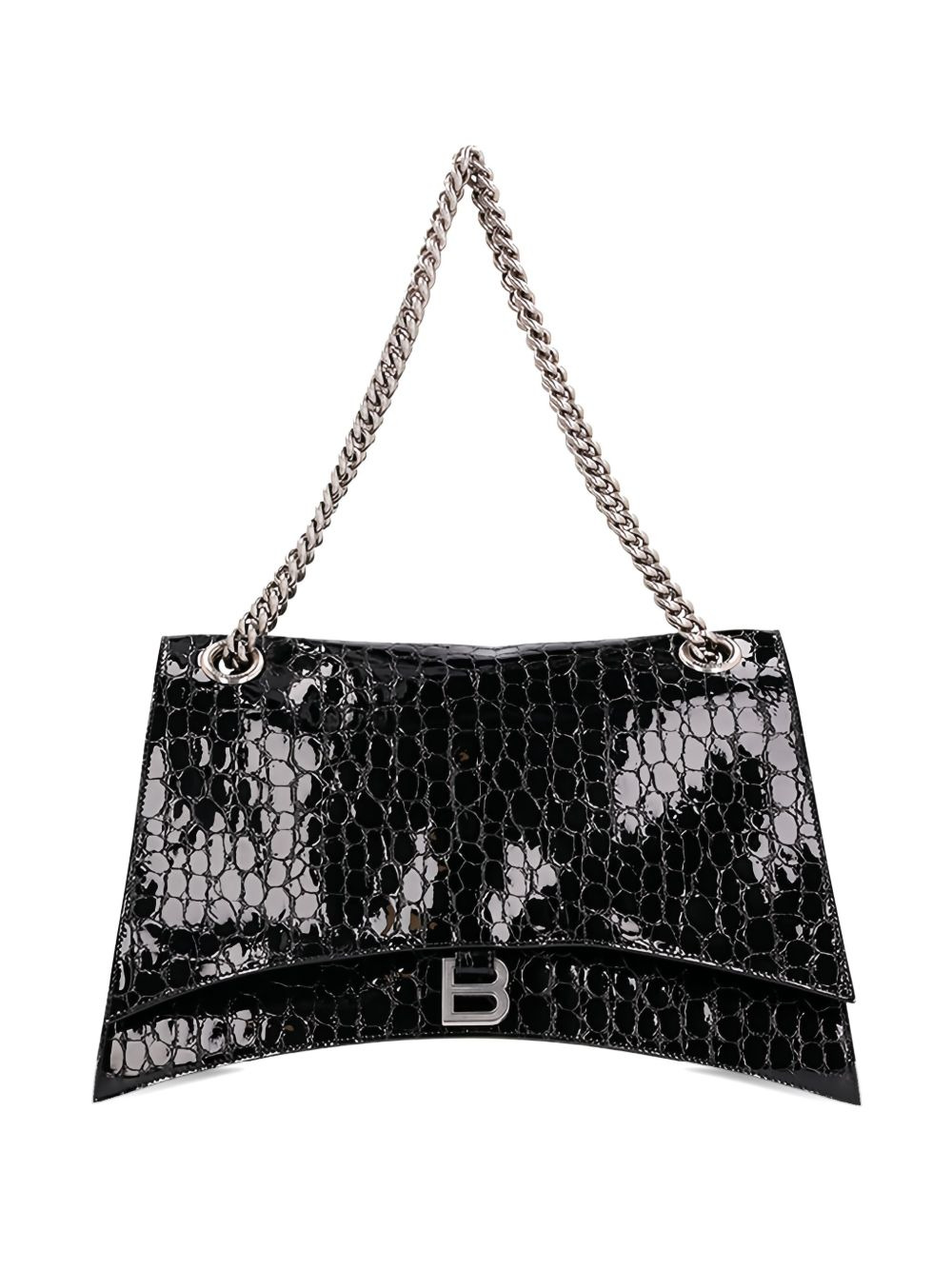 large Crush crocodile-effect shoulder bag A brand signature, Balenciaga's Crush bag is characterised by its arched silhouette and 'B' logo plaque accent. Presented in large size, this iteration is crafted from leather with a glossy, crocodile effect. Highlights - Black - Calf leather - Embossed crocodile effect - Patent finish - Silver-tone hardware - Silver-tone logo plaque - Sliding chain-link shoulder strap - Foldover top with magnetic fastening Made in Italy Composition Outer: CALFSKIN 100% Lining: Fabric 100% SIZE & FIT Measurement DEPTH 5.1 in(12.9 cm) HEIGHT 9.8 in(24.8 cm) WIDTH 15.7 in(39.8 cm)