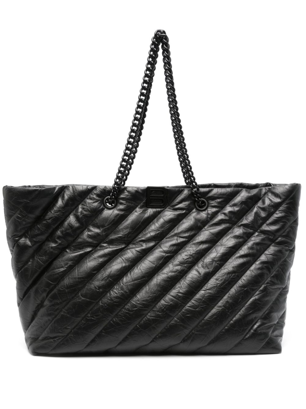 large Crush quilted tote bag Presented in a large size, this Crush tote bag exemplifies Balenciaga's penchant for oversized accessories. It's crafted from quilted leather in a slouchy silhouette, accented with a tonal 'B' logo and two chain-link handles. Highlights - Black - Calf leather - Quilted - Crinkled finish - Tonal logo plaque - Two chain-link top handles - Main compartment - Internal zip-fastening pocket - Internal logo patch - Full lining - Tonal hardware - Turn-clasp fastening - This piece comes complete with a protective dust bag. Made in Italy Composition Outer: Calf Leather 100% SIZE & FIT Model measurements Height 5 ft 10 in(1.77 m) Bust/Chest 32.28 in(82 cm) Hips 35.03 in(89 cm) Waist 25.19 in(64 cm) Measurement DEPTH 6.29 in(16 cm) HANDLE 9.05 in(23 cm) HEIGHT 12.2 in(31 cm) WIDTH 22.83 in(58 cm)