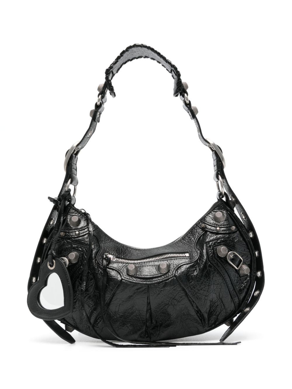Le Cagole S leather shoulder bag Balenciaga's La Cagole bag features multiple elements of silver-tone hardware detailing such as buckle fastenings, stud embellishment, zip fastenings and shoulder-strap eyelet detailing, on tonal, textured-finish leather, which adds to the brand's signature maximalist style. Highlights - Black - Calf leather - Crocodile-effect embossed leather strap - Adjustable shoulder strap - Metal eyelet detailing - Mirror tag - Stud and pleat detailing to the front - Decorative buckle detail - Front zip-fastening pocket - Rear zip-fastening pocket - Main compartment - Internal zip-fastening pocket - Internal logo tag - Full lining - Silver-tone hardware - Top zip fastening - This piece comes complete with a protective dust bag. Made in Italy Composition Outer: Lamb Skin 100% SIZE & FIT Model measurements Height 5 ft 9 in(1.75 m) Bust/Chest 34.64 in(88 cm) Hips 36.61 in(93 cm) Waist 26.37 in(67 cm) Measurement DEPTH 3.3 in(8.3 cm) HEIGHT 6.29 in(16 cm) WIDTH 12.99 in(33 cm) STRAP 19.3 in(49 cm)