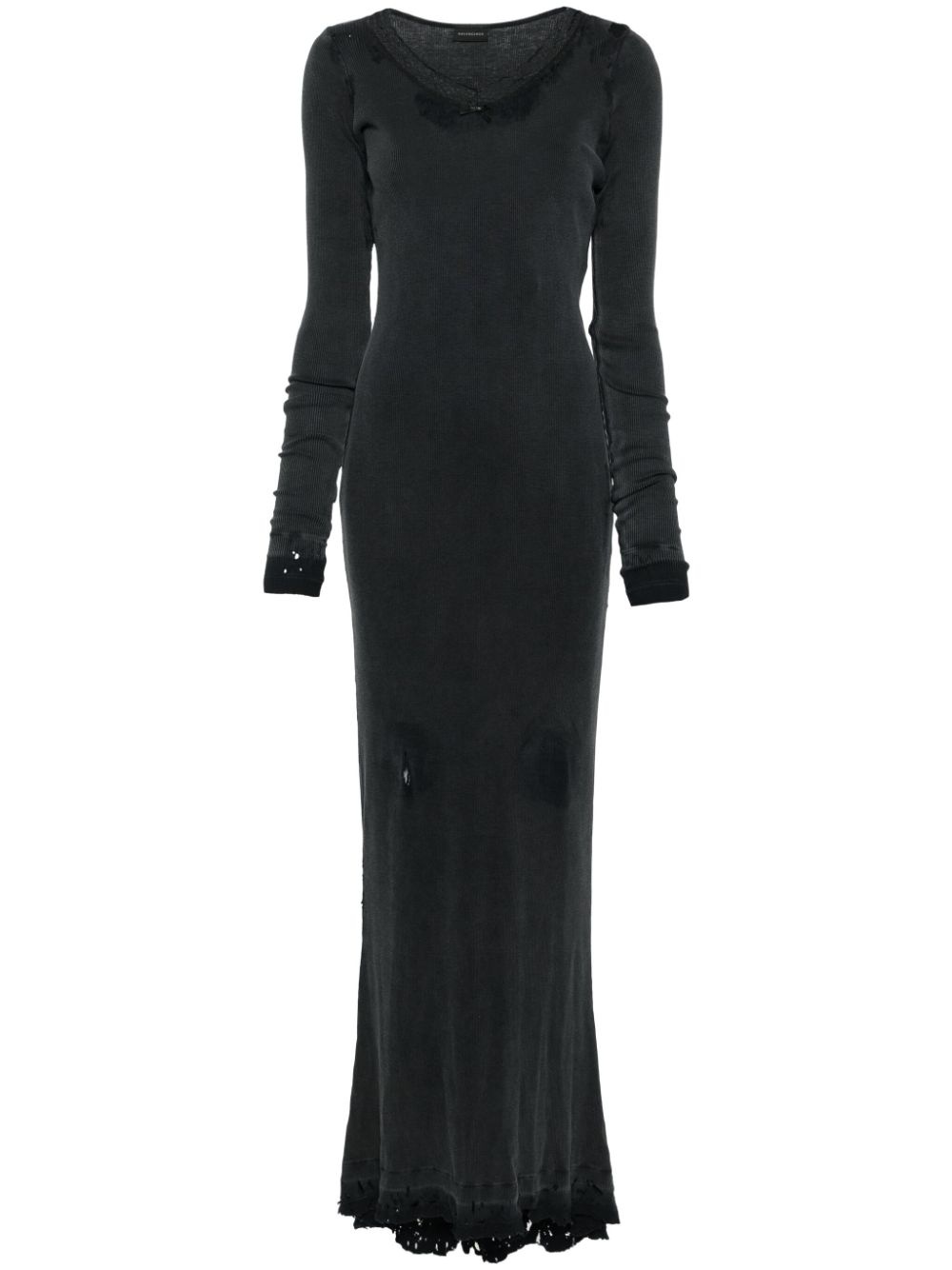 distressed maxi dress Highlights - Black - Cotton - Ribbed knit - Distressed finish - Lace trim - Bow detailing - Scoop neck - Long sleeves with thumb holes - Slim cut - Frayed hem - Demi-train - Floor-length Imported Composition Cotton 100% SIZE & FIT Measurement SLEEVE LENGTH 35.43 in(90 cm) HIPS 30.7 in(78 cm) LENGTH 67.32 in(171 cm) WAIST 26.77 in(68 cm) BUST 32.28 in(82 cm) Shoulder Width 12.99 in(33 cm) Washing instructions Dry Clean Only