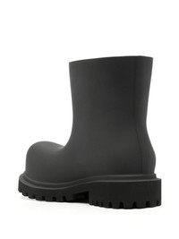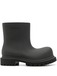 Steroid ankle boots Recalling wellie styles, these black Balenciaga boots are cut from a rubbery material to an ankle-length silhouette characterised by an exaggerated, bulbous round toe. To the side, embossed logo lettering adds a subtle branding note. Highlights - Black - Round toe - Embossed logo to the side - Slip-on style - Rubber sole Made in Italy Composition Outer: Rubber 100% Sole: Rubber 100% Lining: Rubber 100%, Fabric 100% SIZE & FIT Measurement CIRCUMFERENCE 12.59 in(32 cm) HEEL 1.96 in(5 cm) HEIGHT 6.69 in(17 cm) Sole height 1.37 in(3.5 cm)
