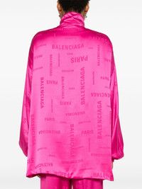 logo-jacquard sweatshirt A beguiling mix of cut, fabric and pattern, this Balenciaga jacket is cut to an exaggerated track silhouette from lustrous fuchsia satin woven with logo and Paris lettering. Elasticated cuffs and a funnel neck nod to its sporty roots. Highlights - Fuchsia pink - Silk - Satin weave - Jacquard logo motif - Front zip fastening - High neck - Drop shoulder - Long sleeves - Elasticated cuffs - Two side welt pockets - Logo-jacquard lining - Straight hem Made in Italy Composition Silk 100% SIZE & FIT Model measurements Height 5 ft 11 in(1.8 m) Bust/Chest 32.67 in(83 cm) Hips 35.03 in(89 cm) Waist 25.19 in(64 cm) FittingInformation Designed for an oversized fit, offering additional room throughout Made from a midweight non-stretch fabric Washing instructions Dry Clean Only