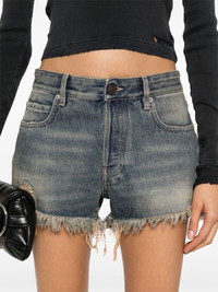 logo-patch denim shorts Highlights - Medium blue - Cotton - Denim - Whiskering effect - Logo patch to the rear - Ripped detailing - Distressed effect - Frayed edge - Belt loops - Classic five pockets - Thigh-length - Front button fastening Made in Italy Composition Outer: Cotton 100% Lining: Polyester 65%, Cotton 35% SIZE & FIT Model measurements Height 5 ft 9 in(1.76 m) Bust/Chest 31.88 in(81 cm) Hips 35.43 in(90 cm) Waist 24.8 in(63 cm) FittingInformation Designed for a slim fit that sits just away from the body offering a close yet comfortable fit Sturdy and hard-wearing, this denim piece offers no stretch This piece fits true to size – take your usual size Measurement INSIDE LEG 2 in(5.1 cm) BACK RISE 12.51 in(31.8 cm) HIPS 35.98 in(91.4 cm) Hem Width 22 in(55.9 cm) WAIST 30.98 in(78.7 cm)