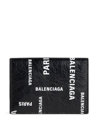 logo-print foldover wallet Balenciaga embraces logomania in the design of this foldover wallet: note the contrasting white moniker graphics that adorn the black leather construction. It opens to reveal a main compartment secured with a press-stud fastening. Highlights - Black/white - Lambskin - All-over logo print - Foldover top with press-stud fastening - Main compartment Made in Italy Composition Outer: Lambskin 100%