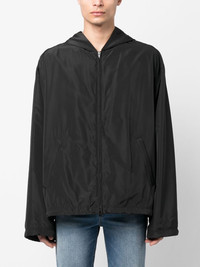 logo-print hooded windbreaker Cut for Balenciaga's signature oversized style, this black windbreaker jacket is elevated by a white logo embroidered at the back for a branding-focused finish. Highlights - Black/white - Lightweight construction - Logo print to the rear - Classic hood - Front two-way zip fastening - Drop shoulder - Long wide sleeves - Drawstring cuffs - Internal zip-fastening pockets - Two side zip-fastening pockets - Drawstring hem - Mesh lining Made in Italy Composition Lining: Polyester 100% Outer: Viscose 47% SIZE & FIT Model measurements Height 6 ft 1 in(1.85 m) Bust/Chest 35.82 in(91 cm) Hips 37.79 in(96 cm) Waist 29.13 in(74 cm) FittingInformation This piece fits true to size. We recommend you get your regular size Cut for a loose fit Made with a mid-weight non-stretch fabric Washing instructions Dry Clean Only