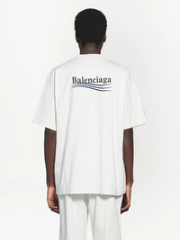 Political Campaign T-shirt Playful in their design approach, Balenciaga puts a political spin on this iteration of the brand's logo. Printed at the chest and at the back of a classic T-shirt silhouette, the brand's minimalist feel is also maintained. Highlights - White - Cotton - Logo print at the chest - Logo print to the rear - Round neck - Drop shoulder - Short sleeves - Straight hem Imported Composition Outer: Cotton 100% SIZE & FIT Measurement CHEST 49.6 in(126 cm) Shoulder Width 22.83 in(58 cm) Washing instructions Machine Wash