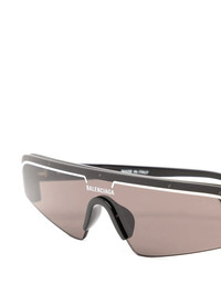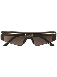 Mask frame sunglasses Balenciaga's contradictory bold yet discreet aesthetic is captured in these statement Mask sunglasses that on the one hand conceal with their dark grey tinted lenses whilst also stand out with their oversized frames. Highlights - Black/white - Rectangle frame - Tinted lenses - Uv-protective lenses - Logo print to the front - Straight arms - Curved tips - Logo print at the tips - We know you'll look after them, but these glasses come with protection, just in case. Made in Italy Composition Plastic 100% SIZE & FIT Measurement Arm Length 5.7 in(14.5 cm) Bridge Width 0.78 in(2 cm) Lens Diameter 2.55 in(6.5 cm) Total Width 5.7 in(14.5 cm)