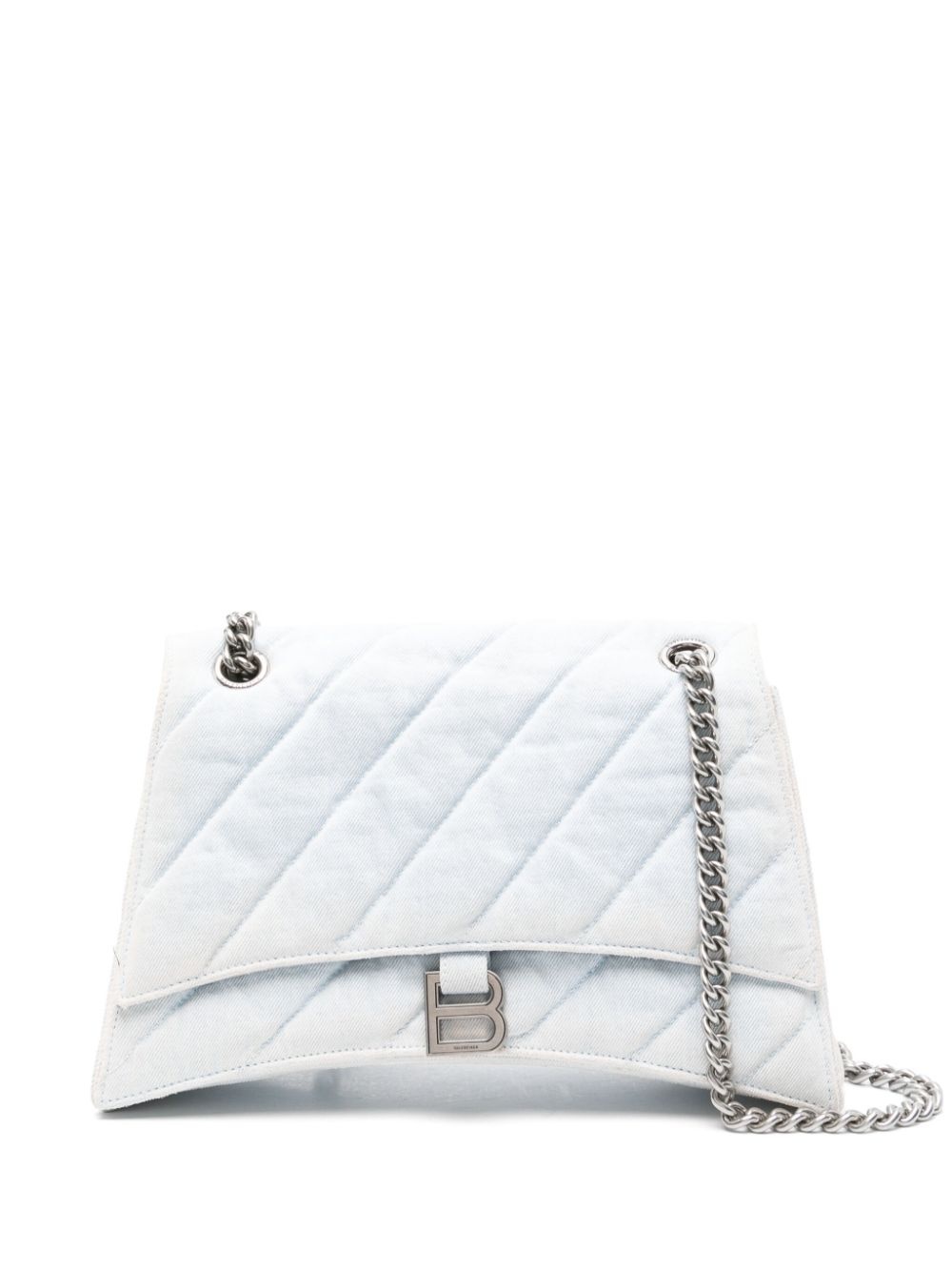 medium Crush shoulder bag Characterised by its arching silhouette, Balenciaga's Crush bag highlights the brand's focus on contemporary design. This iteration is presented in distressed light-wash denim with diagonal quilting and topped with a signature B plaque and chain strap in matching silver-tone metal. Highlights - Light blue - Cotton - Washed denim - Distressed effect - Padded design - Chain-link shoulder strap - B logo plaque at the front - Partitioned compartment - Internal zip-fastening pocket - Internal slip pocket - Internal logo stamp - Silver-tone hardware - Foldover top with magnetic fastening - This piece comes complete with a protective dust bag. Made in Italy Composition Outer: Cotton 100% SIZE & FIT Model measurements Height 5 ft 10 in(1.77 m) Bust/Chest 32.28 in(82 cm) Hips 35.03 in(89 cm) Waist 25.19 in(64 cm) Measurement DEPTH 3.93 in(10 cm) HANDLE 11.81 in(30 cm) HEIGHT 7.48 in(19 cm) STRAP 44.48 in(113 cm) WIDTH 12.2 in(31 cm)