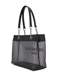 medium Duty Free tote bag Featuring the iconic Balenciaga logo print to the front, this Duty Free mesh tote bag comes with an open top and a removable pouch. The aged-silver chain-link and leather handles merge with an industrial look to create one legitimate Balenciaga design. Highlights - Black - Mesh - Logo print to the front - Chain-link detailing - Two long top handles - Removable pouch Made in Italy Composition Outer: Polyester 95%, Lambskin 5% SIZE & FIT Model measurements Height 5 ft 10 in(1.77 m) Bust/Chest 32.28 in(82 cm) Hips 35.03 in(89 cm) Waist 25.19 in(64 cm) Measurement DEPTH 5.51 in(14 cm) HANDLE 10.62 in(27 cm) HEIGHT 10.23 in(26 cm) WIDTH 13.77 in(35 cm)