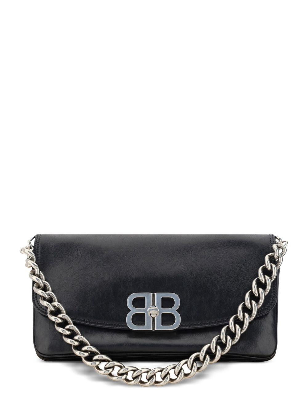 meduium BB Soft shoulder bag Balenciaga's BB Soft Flap bag blends softness and hardness. Crafted from smooth BLACK leather, it boasts a foldover top, twist lock fastening and a chain-link shoulder strap. Meanwhile, the metal silver-tone hardware and logo detailing juxtaposes against the supple, malleable material. Highlights - Black - Calf leather - Smooth grain - Accordion design - Silver-tone logo plaque - Foldover top - Twist-lock fastening - Chain-link shoulder strap - Adjustable detachable shoulder strap - Full lining - Internal logo stamp - Internal zip-fastening pocket - Main compartment - Silver-tone hardware - This piece comes complete with a protective dust bag. Made in Italy Composition Outer: Calf Leather 100% SIZE & FIT Measurement DEPTH 1.2 in(3 cm) HANDLE 7.5 in(19 cm) HEIGHT 6.7 in(17 cm) STRAP 19.7 in(50 cm) WIDTH 11.8 in(29.9 cm)