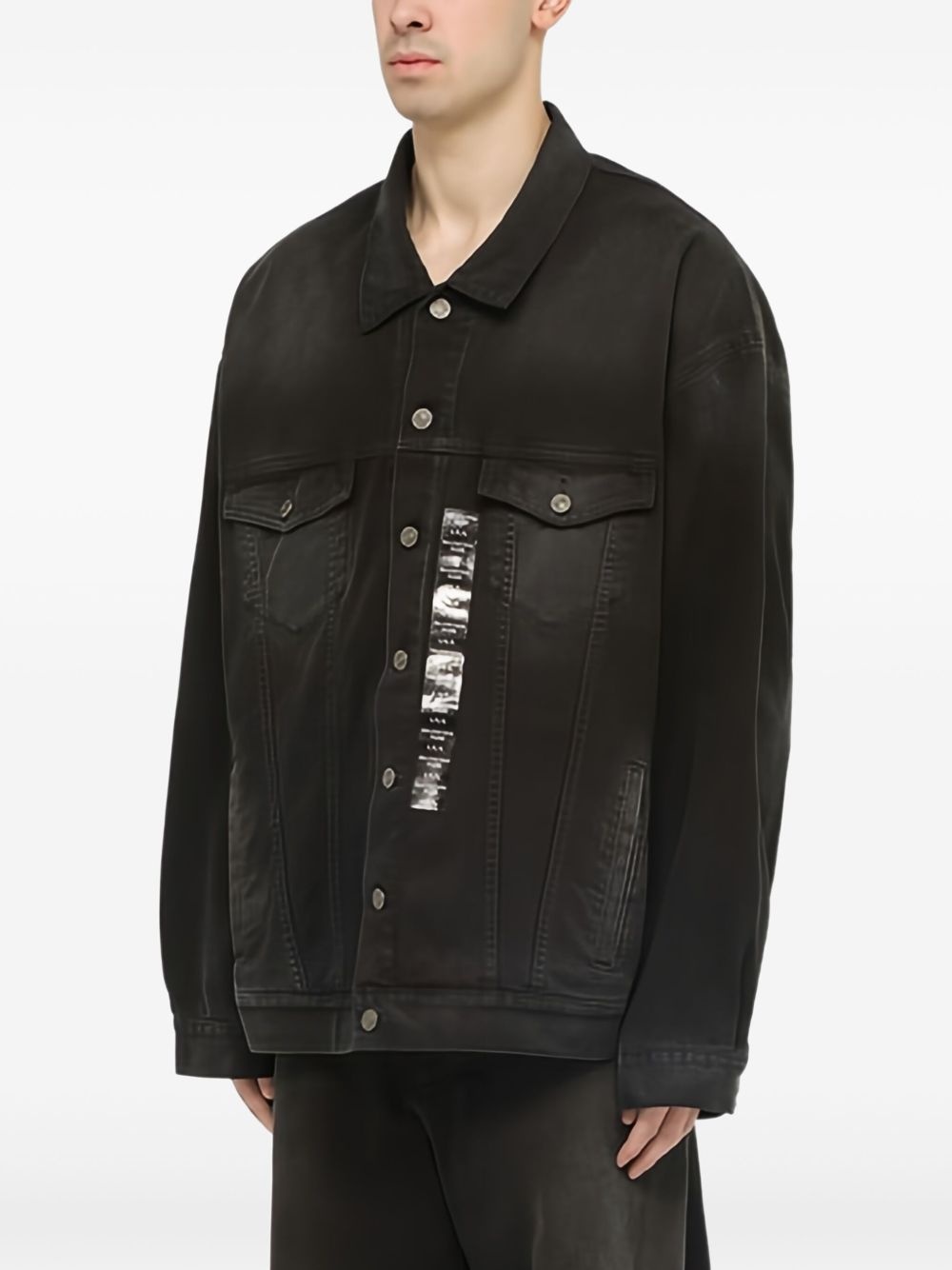 pocketed denim jacket This denim jacket from Balencagia is emblematic of the label's preference for striking and offbeat detailing. It's crafted from grey denim with a subtle bleached effect and detailed with a size sticker and jacron applique at the front. Highlights - Black - Front button fastening - Two chest flap pockets - Two side welt pockets - Long sleeves Made in Italy Composition Lining: Polyester 65%, Cotton 35% Outer: Cotton 100% SIZE & FIT Measurement CHEST 58.66 in(149 cm)