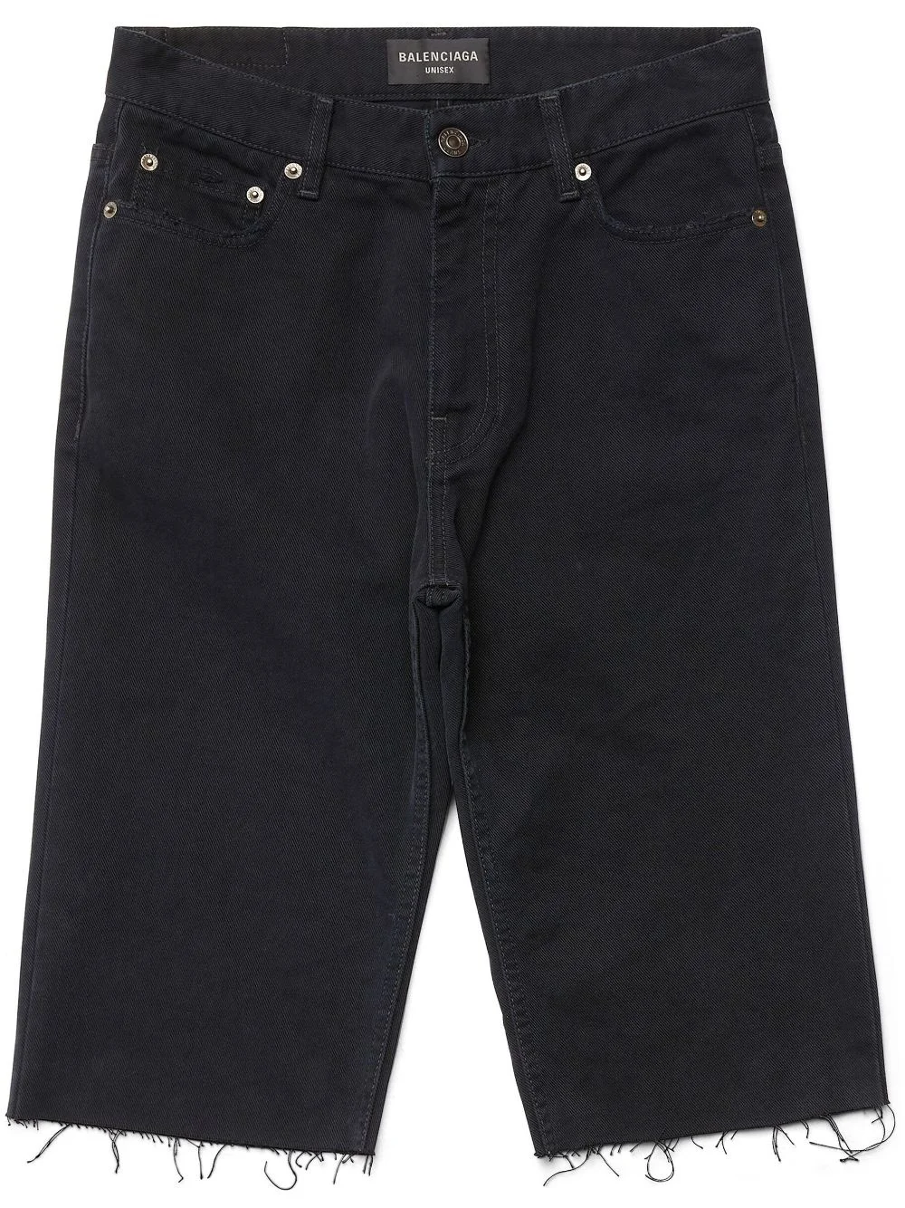 raw-hem denim shorts A loveworn take on denim, these Balenciaga's shorts are characterised by their voluminous proportions and distressed finish. Highlights - Black - Cotton - Denim - Belt loops - Front button and zip fastening - Classic five pockets - Knee-length - Raw-cut edge - When buying this unisex item, keep in mind that it is graded in standard men's sizing. Made in Italy Composition Cotton 100% SIZE & FIT Measurement FRONT RISE 7.87 in(20 cm) INSIDE LEG 14.56 in(37 cm) WAIST 30.7 in(78 cm) Outside Leg 25.19 in(64 cm)