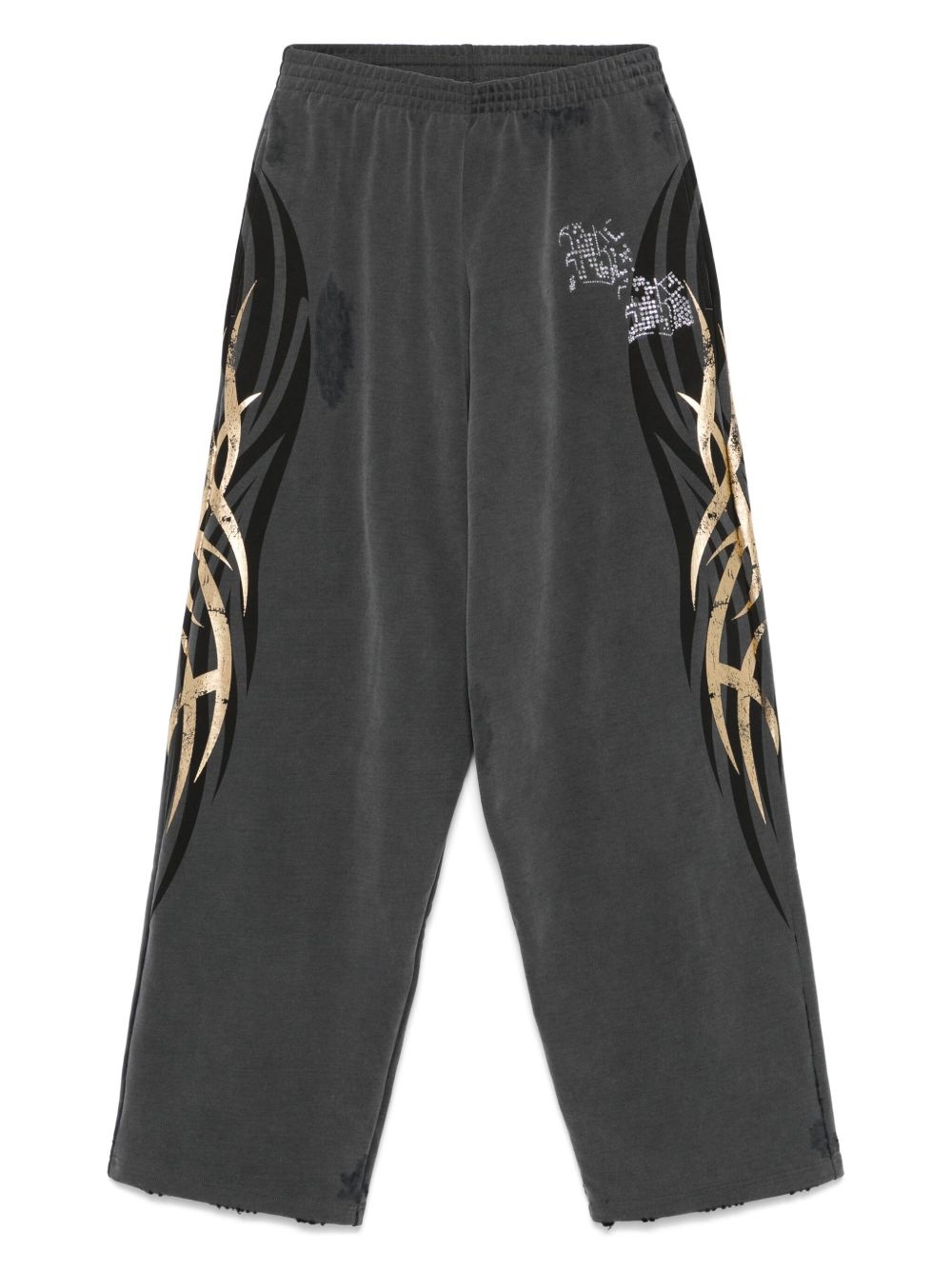 tacky gold-print track pants Highlights - Medium grey - Elasticated waistband with internal drawstring - Two side inset pockets - Rhinestone embellishment - When buying this unisex item, keep in mind that it is graded in standard men's sizing. Imported Composition Outer: Cotton 100% Lining: Cotton 100% SIZE & FIT Model measurements Height 5 ft 11 in(1.8 m) Bust/Chest 31.49 in(80 cm) Hips 36.61 in(93 cm) Waist 24.4 in(62 cm) FittingInformation This piece is unisex and is designed with a wide-leg, whether you usually select women's or men's sizes The elasticated waist allows for a comfortable fit Made from a midweight non-stretch fabric, this piece offers minimal elasticity when worn Measurement FRONT RISE 13.38 in(34 cm) INSIDE LEG 33.85 in(86 cm) Hem Width 22.83 in(58 cm) WAIST 29.13 in(74 cm) Outside Leg 44.88 in(114 cm)