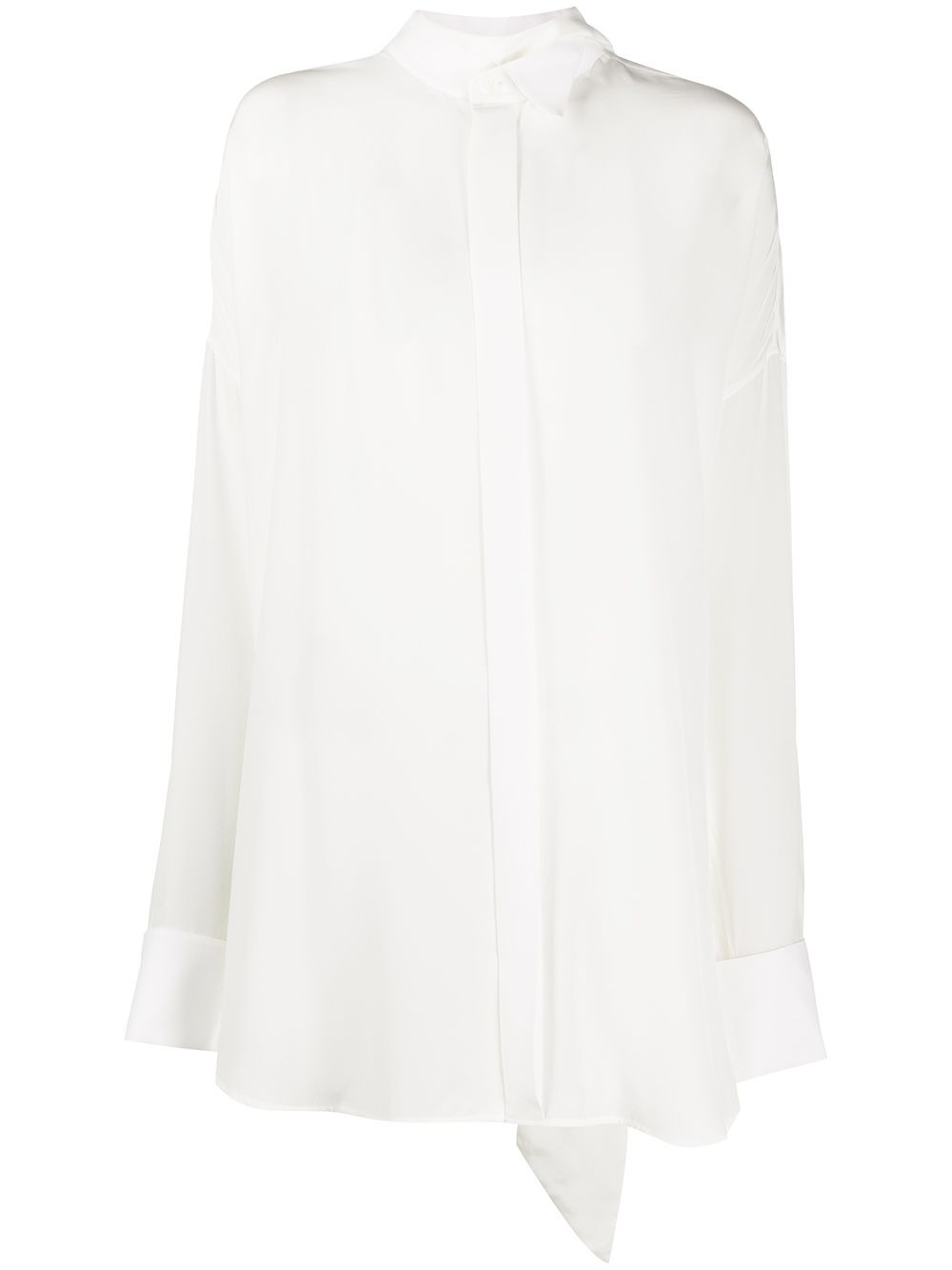tuxedo scarf shirt The classic white shirt just got an upgrade. Boasting a cotton construction, this tuxedo scarf shirt will elevate any of your looks with so less effort. Because classics are never too classic when Balenciaga is around. Highlights - White - Cotton - Double collar - Concealed front button fastening - Long sleeves - Tuxedo cuffs - Scarf detail on the back Made in Italy Composition Cotton 100% SIZE & FIT Model measurements Height 5 ft 10 in(1.78 m) Bust/Chest 34.25 in(87 cm) Hips 35.03 in(89 cm) Waist 26.37 in(67 cm) FittingInformation This piece fits true to size. We recommend you get your regular size Cut for a loose fit Made with a mid-weight non-stretch fabric Washing instructions Dry Clean Only