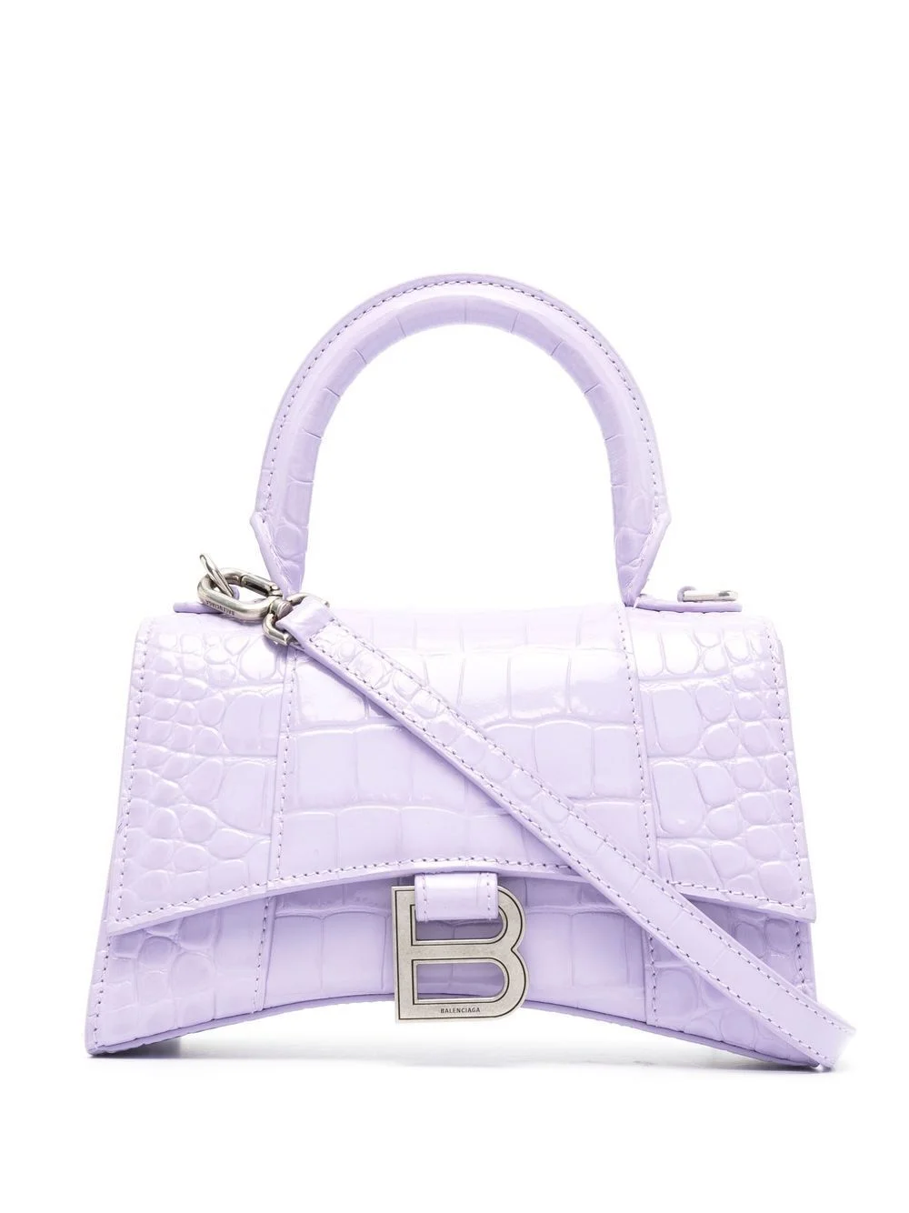 XS Hourglass top-handle bag XS Hourglass top-handle bag from BALENCIAGA featuring lilac, patent leather, embossed crocodile effect, curve-edge body, logo charm, silver-tone hardware, single rounded top handle, front flap closure, magnetic fastening, slip pocket to the rear and adjustable detachable shoulder strap. POSITIVELY CONSCIOUS: We've partnered with Good On You — an ethical agency that rates how sustainably brands perform across various people, planet and animal welfare criteria. This product comes from a Conscious brand that performs well in relation to their impact on the planet, for example ensures the use of materials that limit the amount of chemicals, water and wastewater involved in production processes.. Made in Italy Composition Outer: Calf Leather 100% SIZE & FIT Measurement DEPTH 2.36 in(6 cm) HANDLE 5.9 in(15 cm) HEIGHT 4.33 in(11 cm) STRAP 24.8 in(63 cm) WIDTH 7.4 in(18.7 cm)