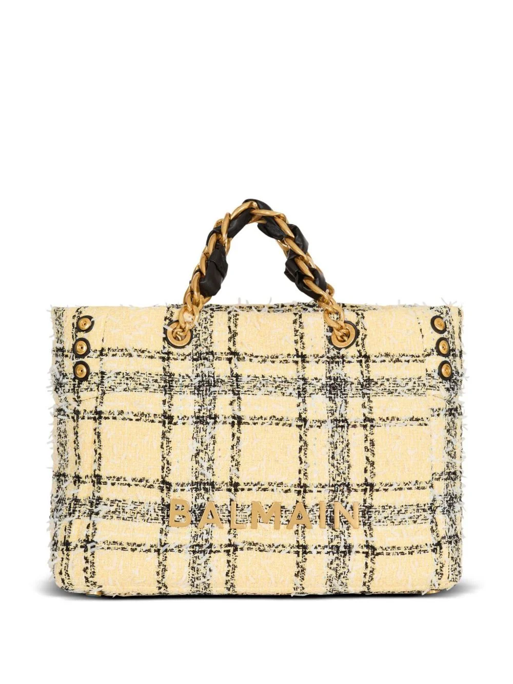 1945 plaid-pattern tote bag Highlights - Yellow - Plaid pattern - Chain detail - Top handle - Fringed trim - Gold-tone hardware - Button detail Made in Italy Composition Outer: Leather 100%, Polyester 50%, Polyamide 50%, Cotton 25% SIZE & FIT Measurement DEPTH 5.31 in(13.5 cm) HEIGHT 11.81 in(30 cm) WIDTH 15.74 in(40 cm)