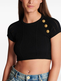 3-Button knitted crop top Highlights - Black - Fine knit - Gold-tone buttons - Round neck - Short sleeves - Cropped Made in Italy Composition Viscose 84%, Polyester 16% Washing instructions Read Manufacturer Guidelines