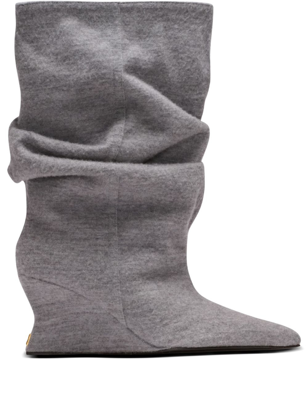 75mm slouchy wedge ankle boots Highlights - Grey - Slouchy shaft - Wedge heel - Pointed toe Made in Italy Composition Outer: Wool 50%, Cotton 47%, Polyamide 3% Lining: Calf Leather 100% Sole: Calf Leather 100% SIZE & FIT Measurement HEEL 2.95 in(7.5 cm) Washing instructions Specialist Cleaning