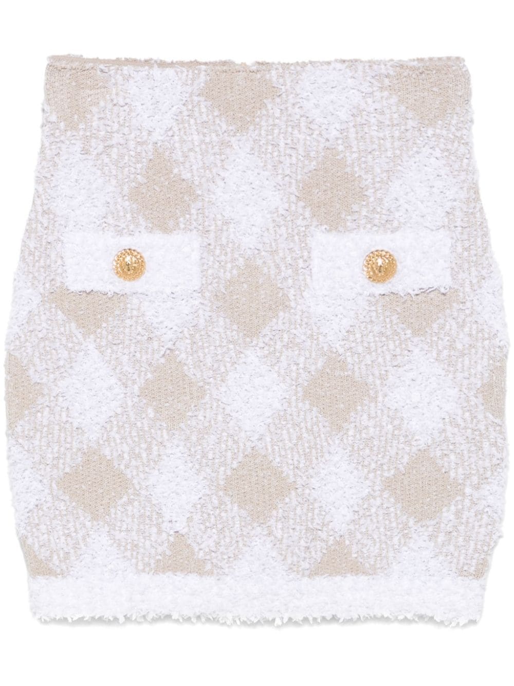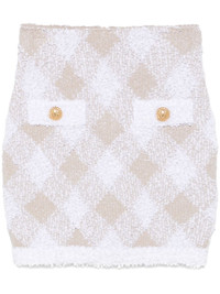argyle-pattern mini skirt Highlights - White/light beige - Stretch-design - Knitted construction - Argyle check pattern - Metallic threading - Rear zip fastening - Elasticated waistband - Two faux front flap pockets - Logo-engraved buttons - Ribbed hem - Thigh-length Made in France Composition Polyamide 47%, Viscose 42%, Polyester 8%, Metallized Polyester 3% SIZE & FIT Model measurements Height 5 ft 10 in(1.78 m) Bust/Chest 33.85 in(86 cm) Hips 36.61 in(93 cm) Waist 26.77 in(68 cm) FittingInformation This mini-length skirt is intended to be worn just below the waist The elasticated waist allows for a comfortable fit Made from a midweight non-stretch fabric, this piece offers minimal elasticity when worn