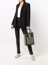 B-Army shopper tote A contrasting leather trim adds a playful touch to this B-Army Shopper from Balmain. It is paired with an understated green tone, creating an eye-catching and unpredictable aesthetic. Made in Italy Composition Outer: Calf Leather 100%, Cotton 100% Lining: Calf Leather 100%, Cotton 100% SIZE & FIT Measurement DEPTH 2.55 in(6.5 cm) HEIGHT 12.59 in(32 cm) WIDTH 10.23 in(26 cm)