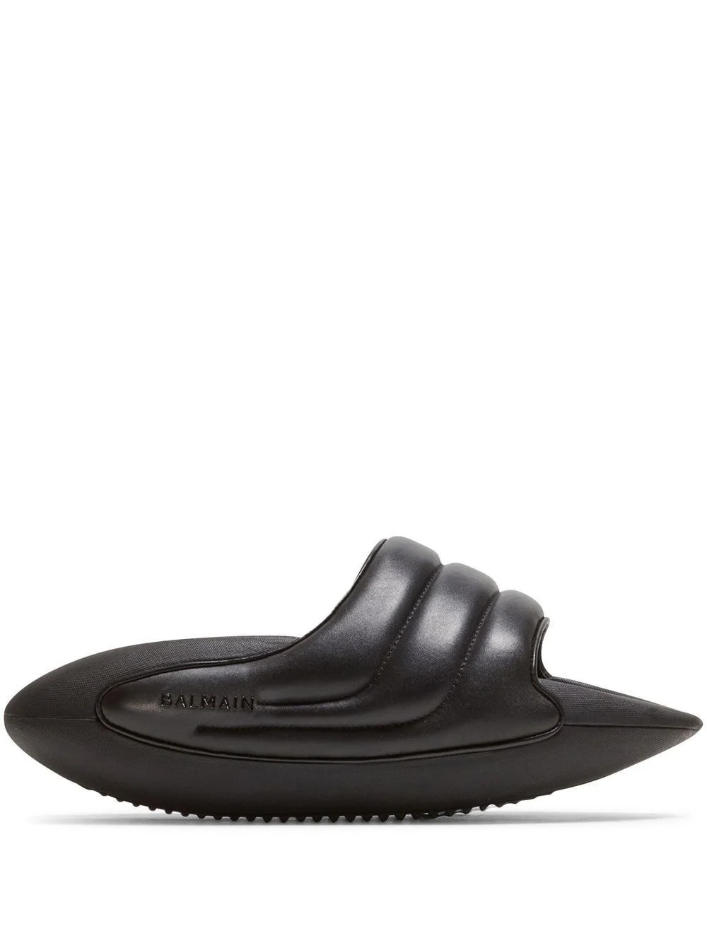 B-It-Puffy quilted slides Reflecting the brand's love for bold silhouettes, Balmain presents these slides as part of their SS23 offer. Crafted from lambskin, these slides feature a puffy quilted leather upper that sits atop a cloud-like platform. The logo lettering on the side offers instant recognition. Imported Composition Lining: Lamb Skin 100% Outer: Lamb Skin 100% Sole: Lamb Skin 100% SIZE & FIT Measurement HEEL 2.75 in(7 cm) PLATFORM 1.57 in(4 cm) FittingInformation This piece fits large – take one size down