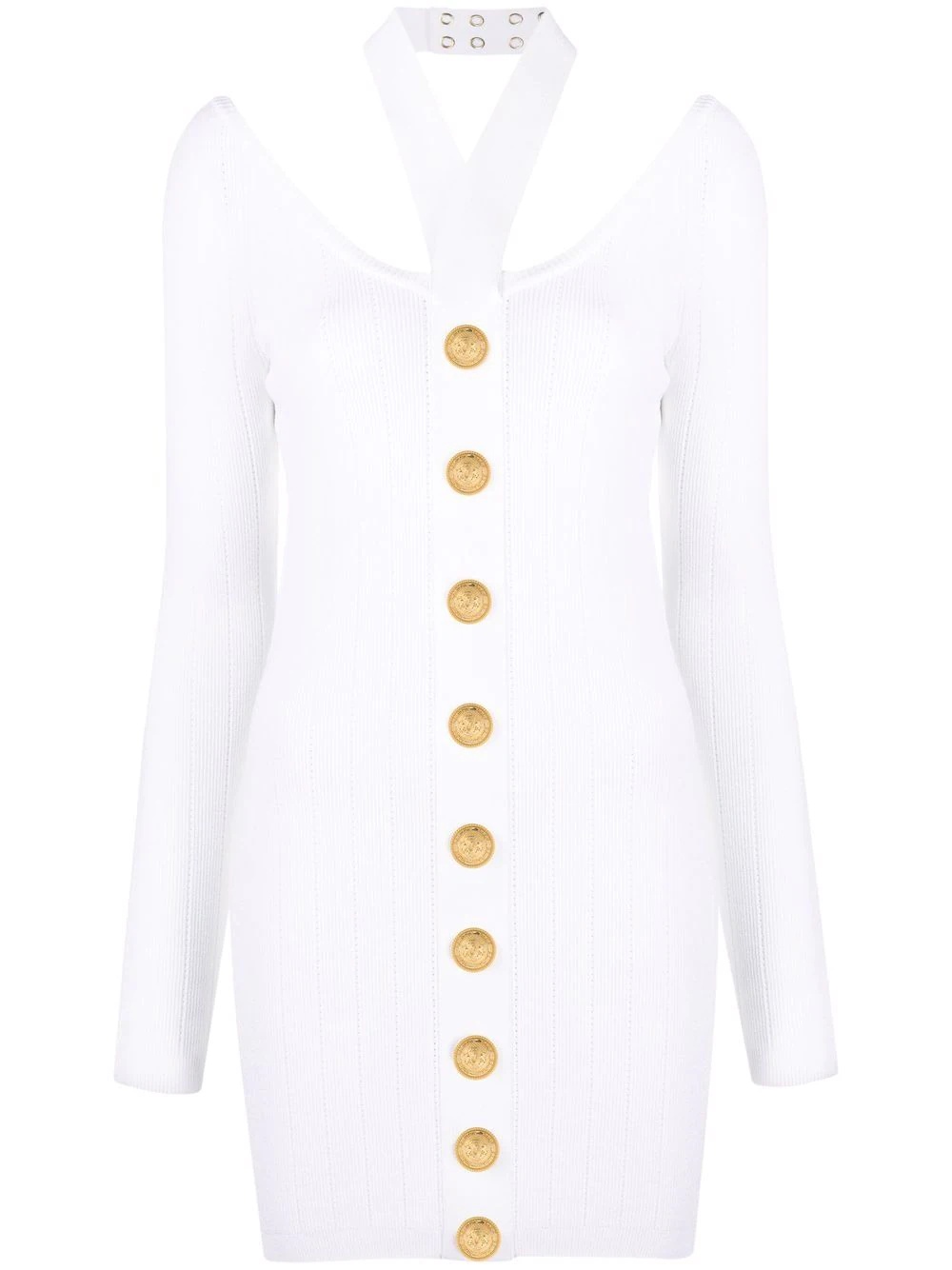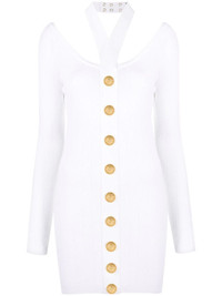 backless knitted dress Balmain's distinctive military aesthetic is showcased with this knitted white dress which is detailed with gold-tone logo-embossed buttons. Made in France Composition Viscose 83%, Polyester 17% SIZE & FIT Model measurements Height 5 ft 11 in(1.8 m) Bust/Chest 31.49 in(80 cm) Hips 35.82 in(91 cm) Waist 24.8 in(63 cm)