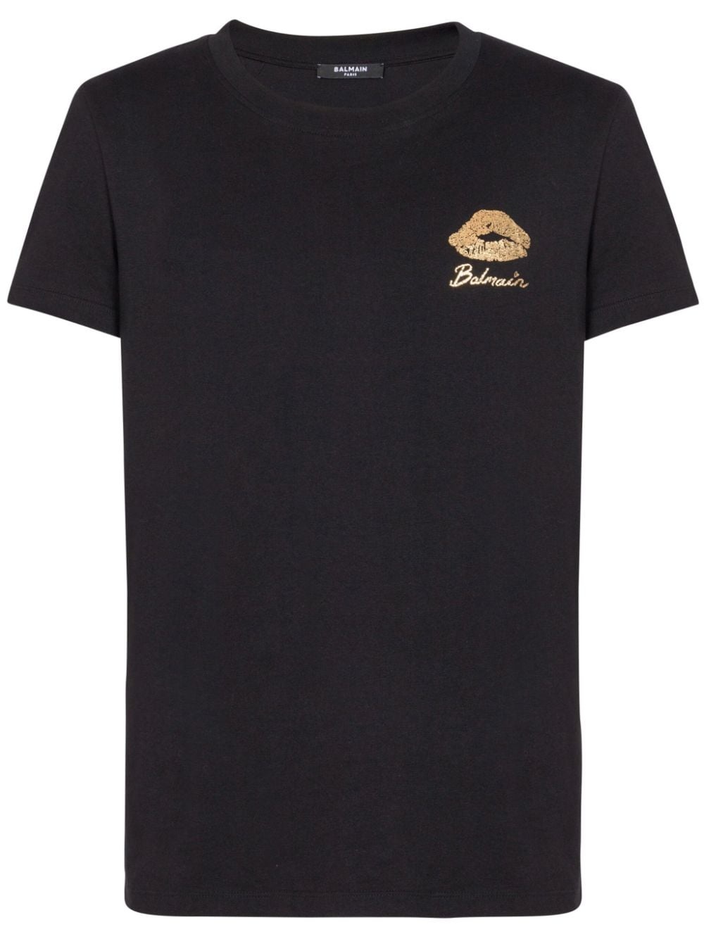 Balmain Kiss print T-shirt Highlights - Black/gold-tone - Cotton - Jersey texture - Lips motif - Logo print at the chest - Crew neck - Short sleeves - Straight hem Made in Italy Composition Cotton 100%