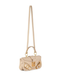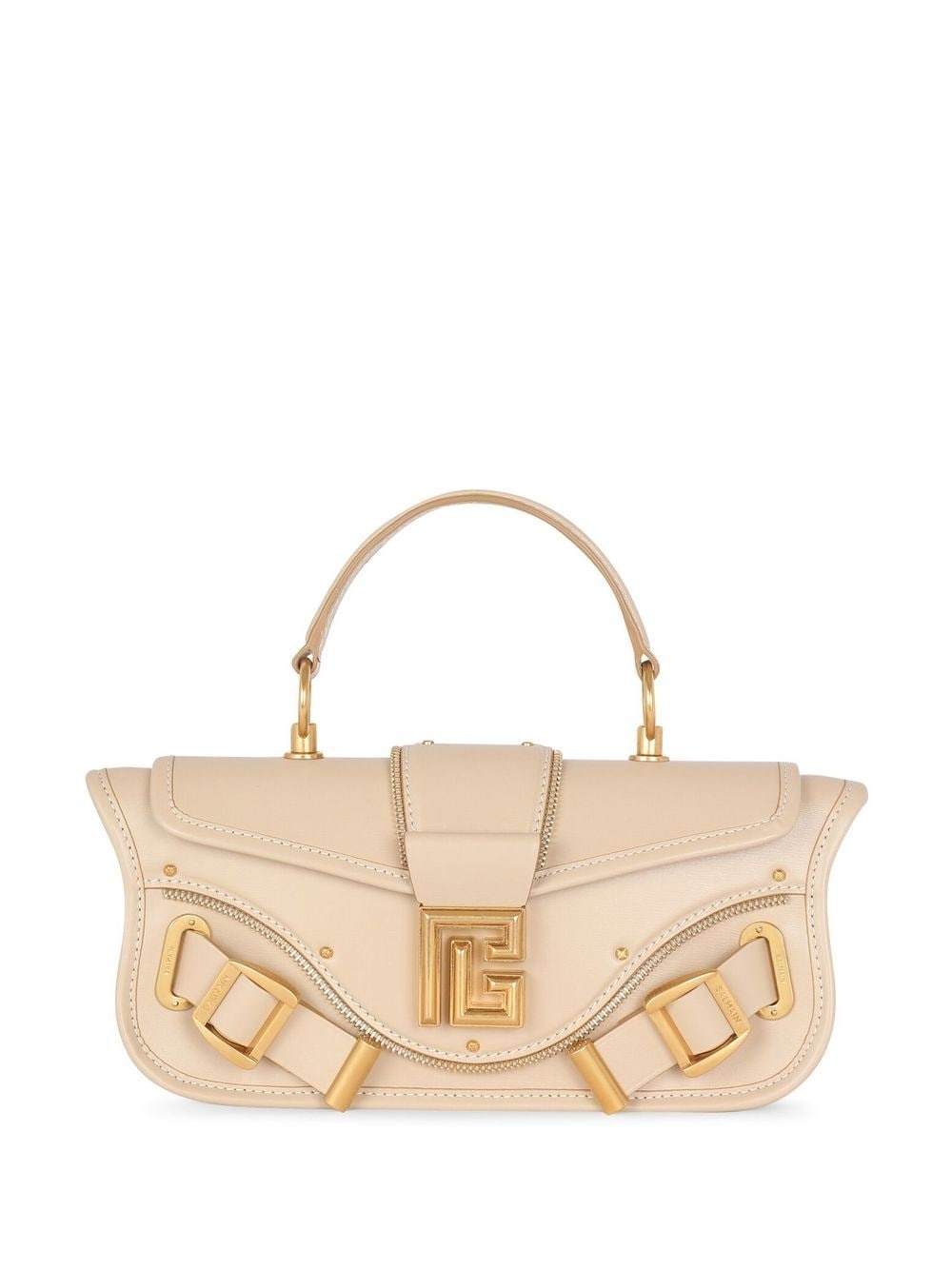 Blaze leather tote bag Balmain’s Blaze bag debuted on their AW22 runway which took inspiration from the details of protective gear. Crafted from leather to a distinctive curved silhouette, this iteration is traced with exposed zips and logo-engraved buckles at the front. Highlights - Almond beige - Leather - Logo plaque - Tonal stitching - Gold-tone hardware - Detachable shoulder strap - Single top handle - Foldover top - Twist-lock fastening - Slip pocket to the rear - Main compartment - Internal slip pocket Made in Italy Composition Outer: Calf Leather 100% Washing instructions Specialist Cleaning