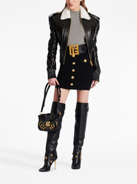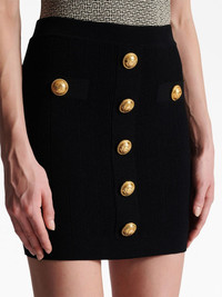 button-detail knitted miniskirt Part of the AW23 collection, this mini skirt by Balmain captures the brand's refined taste. Featuring a black knitted construction, the slim silhouette is decorated with embossed gold-tone buttons. Highlights - Black - Knitted construction - High waist - Ribbed waistband - Rear zip fastening - Embossed gold-tone buttons - Thigh-length Made in Italy Composition Body: Viscose 83%, Polyester 17% SIZE & FIT Measurement HIPS 28.34 in(72 cm) LENGTH 15.74 in(40 cm) WAIST 24.4 in(62 cm)