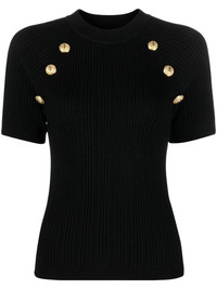 button-detail short-sleeve top Balmain creates designs with a bold sense of elegance. This is showcased on the decorative button detailing on each side of this short-sleeve top, which stand out even more on the garment's tonal colourway. Made in Italy Composition Viscose 83%, Polyamide 17% SIZE & FIT Model measurements Height 5 ft 10 in(1.78 m) Bust/Chest 31.49 in(80 cm) Hips 35.43 in(90 cm) Waist 24.4 in(62 cm) Washing instructions Hand Wash