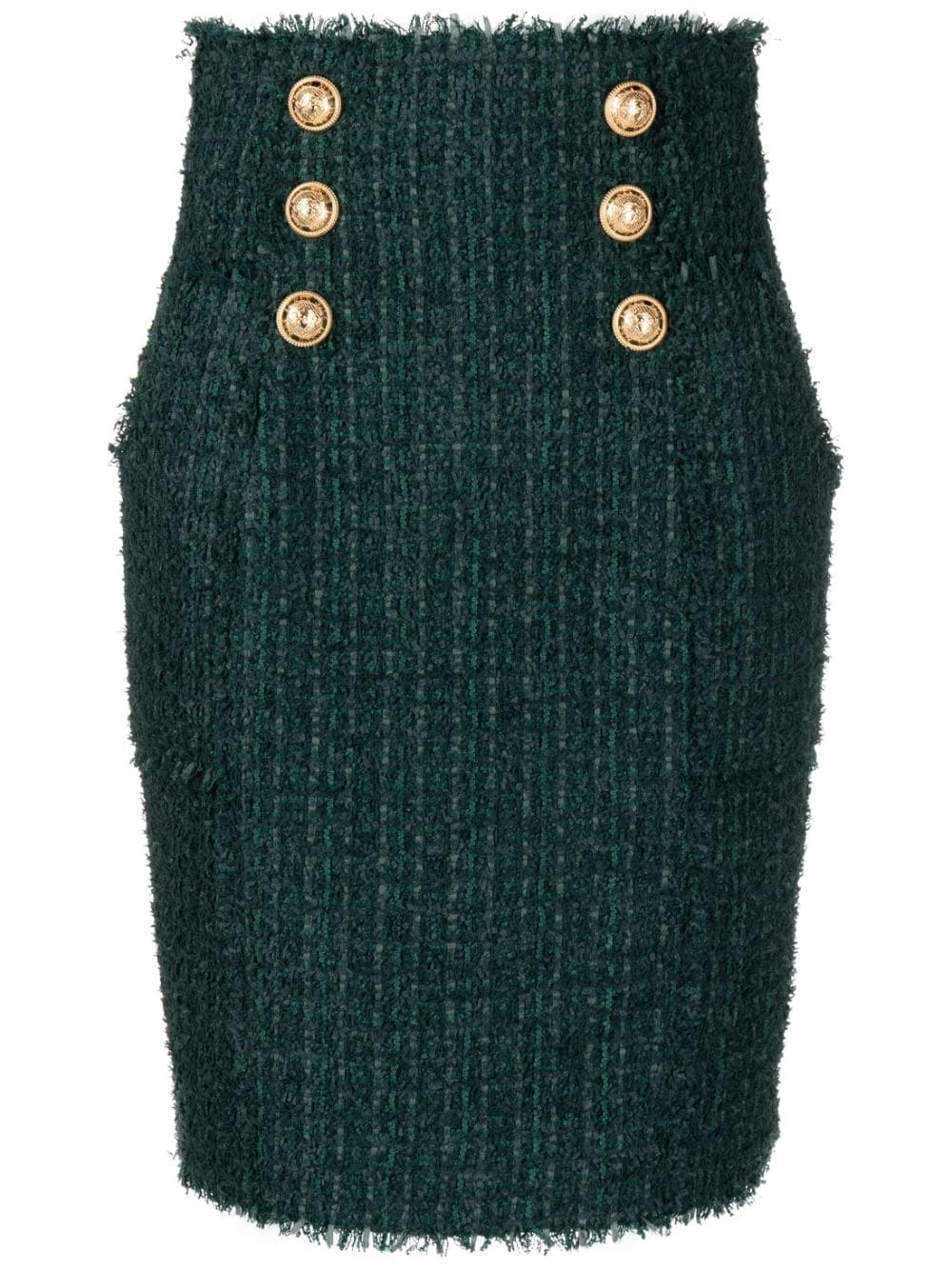 button-detail tweed pencil skirt Cut from tweed to a knee-length silhouette, this Balmain skirt is finished with the signature gold-tone buttons. Highlights - Racing green - Tweed - Decorative button detailing - High-waisted - Fitted waistline - Rear zip fastening - Straight hem - Knee-length Imported Composition Outer: Polyamide 79%, Virgin Wool 15%, Cotton 6% Lining: Viscose 52%, Cotton 48% SIZE & FIT Model measurements Height 5 ft 10 in(1.78 m) Bust/Chest 31.49 in(80 cm) Hips 35.03 in(89 cm) Waist 23.62 in(60 cm) Measurement LENGTH 22.83 in(58 cm) WAIST 23.62 in(60 cm) HIPS 31.49 in(80 cm) FittingInformation This mini-length skirt is intended to be worn high on the waist Made from a midweight non-stretch fabric This piece fits true to size – take your usual size Washing instructions Dry Clean Only