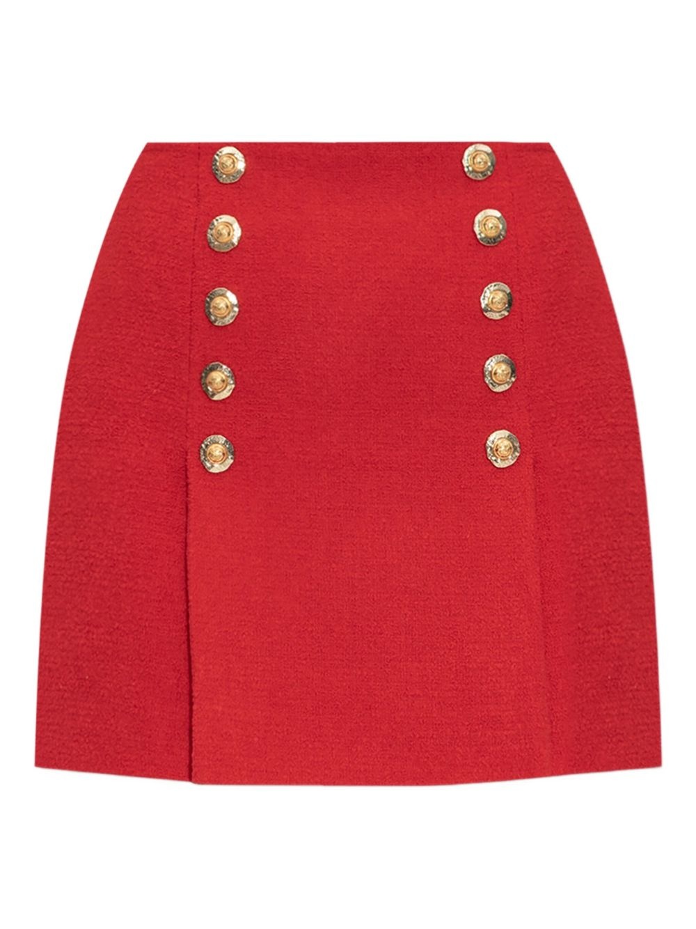 button-detail virgin wool mini skirt Highlights - Cardinal red - Virgin wool - Gold-tone buttons - Double-breasted fastening - A-line Imported Composition Virgin Wool 100% Washing instructions Read Manufacturer Guidelines